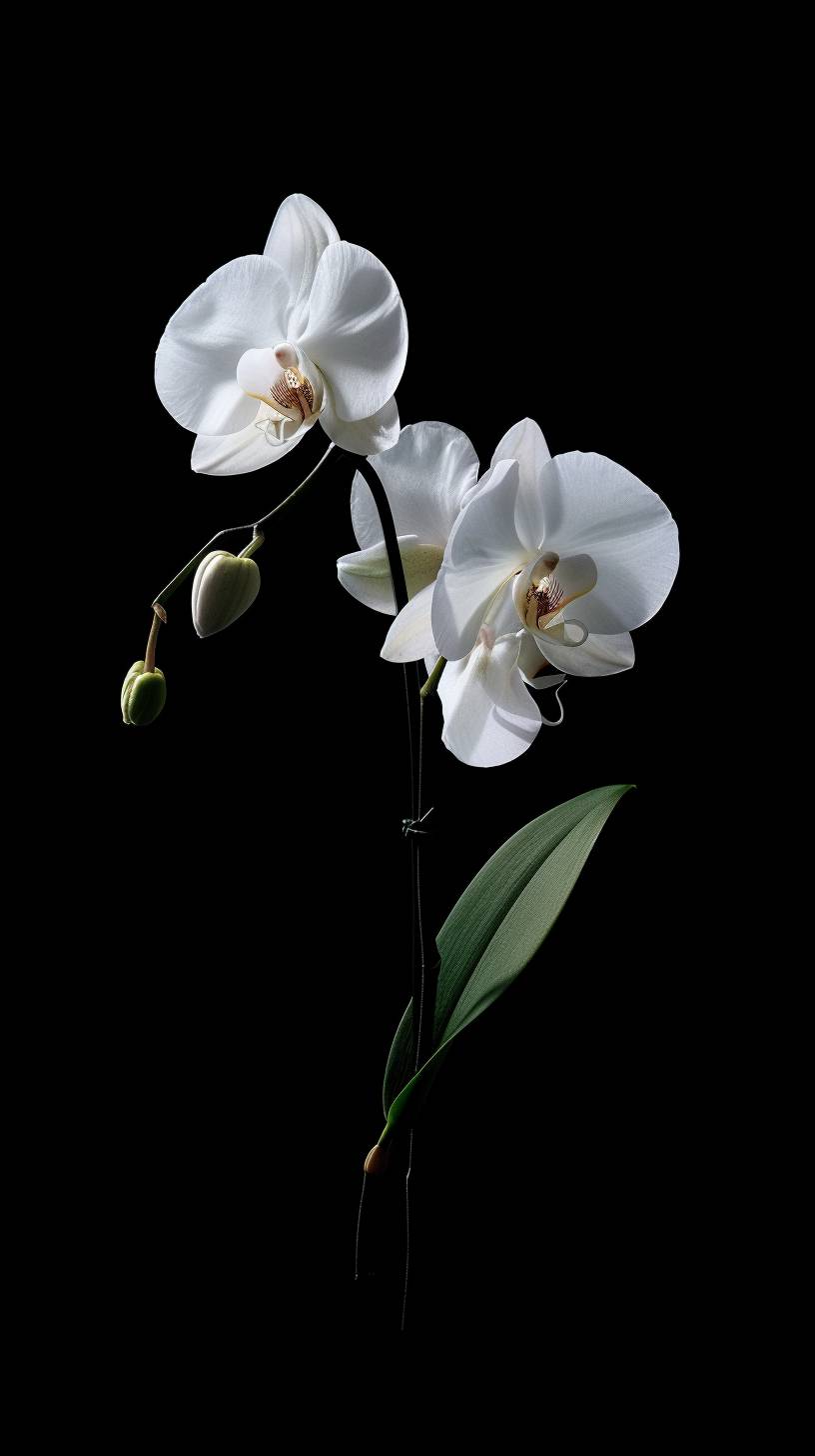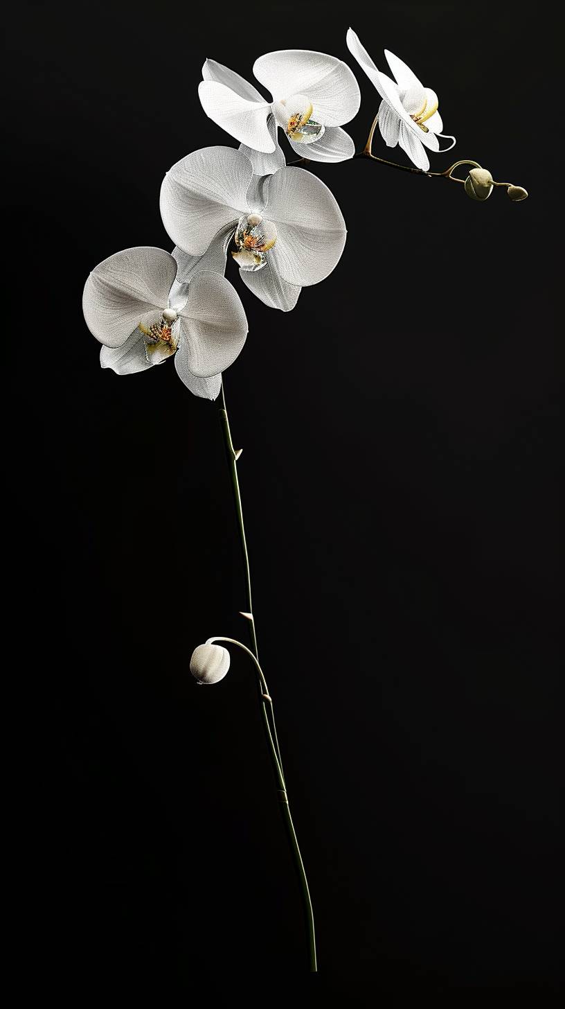 Orquídea blanca única, hiperrealista y ultradetallada sobre un fondo negro.