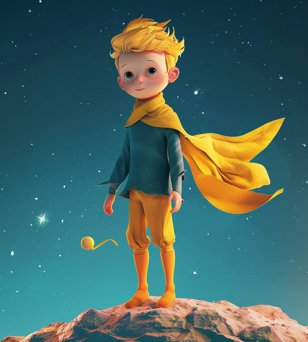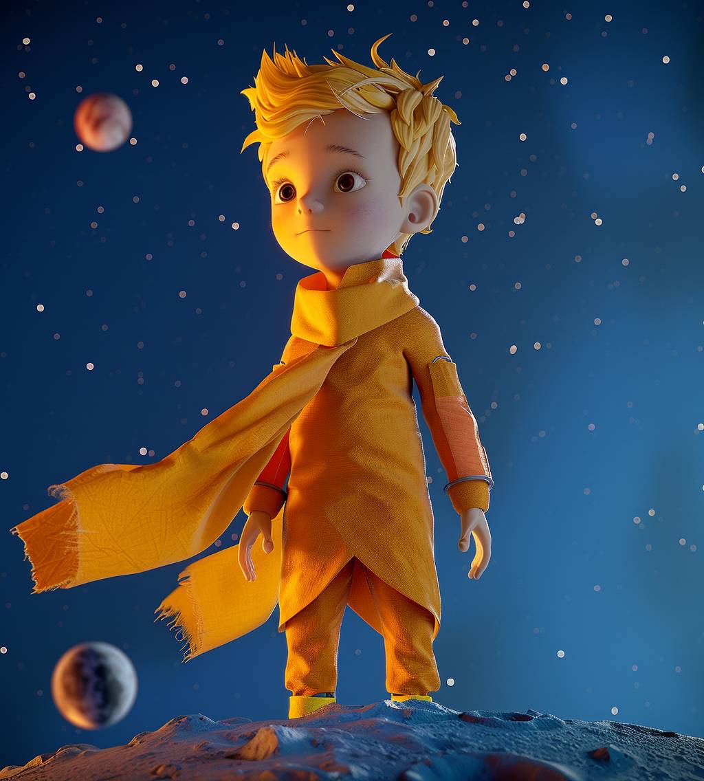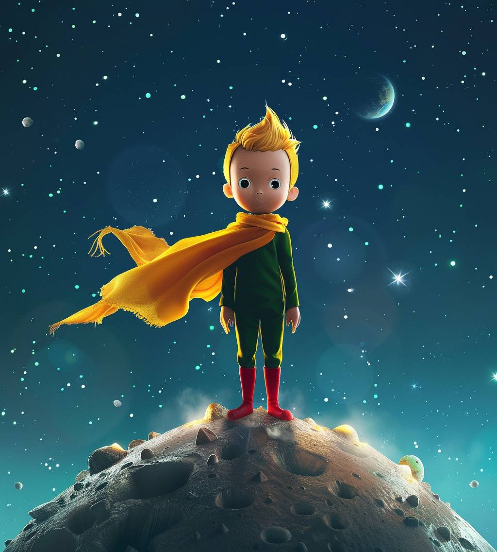 El Principito, con una bufanda amarilla, está de pie en el planeta de la Rosa después de convertirse en un extraterrestre al estilo de la animación de Disney Pixar. El fondo es un cielo estrellado de color azul oscuro sin estrellas. El personaje de dibujos animados representa al lindo principito en una toma de cuerpo completo, similar a un ícono de juego.