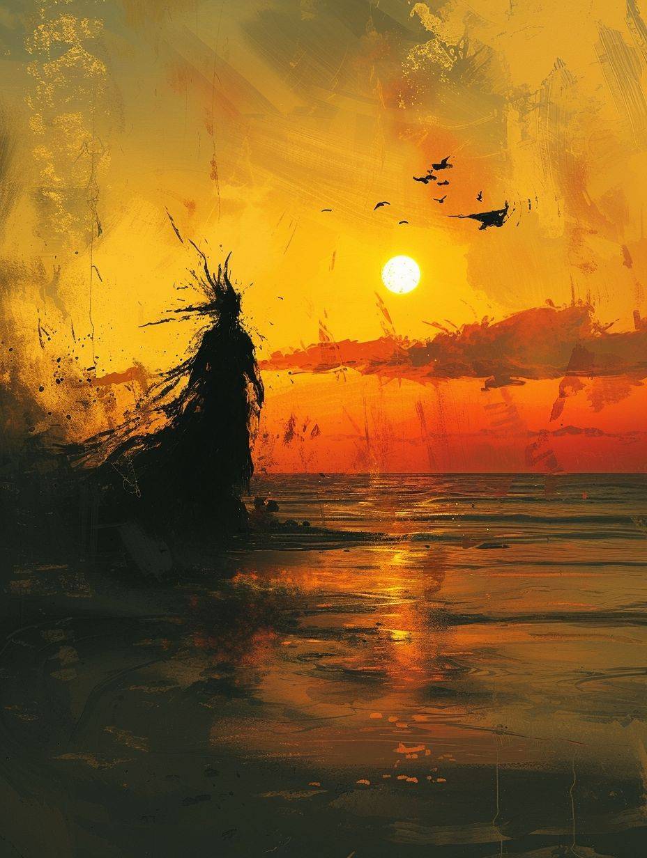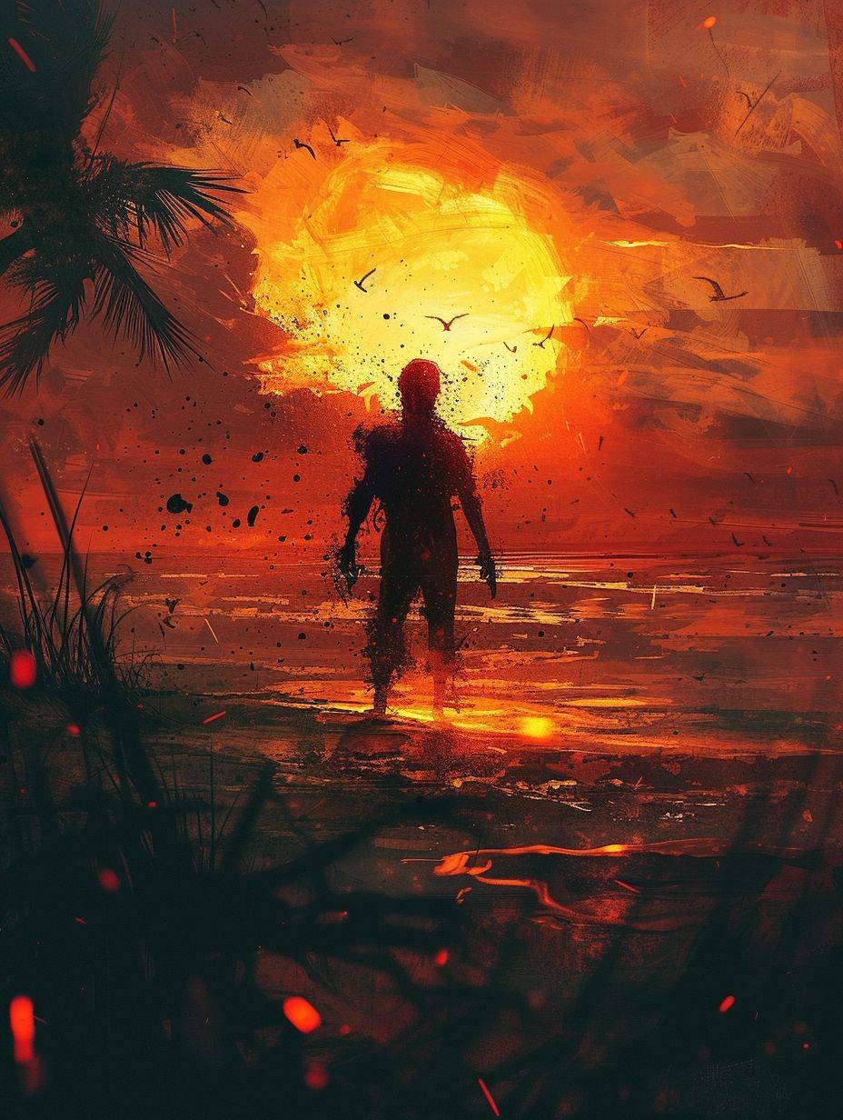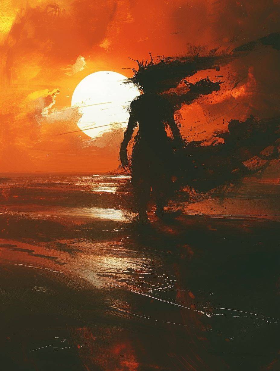 As the sun set over the tranquil beach, a mysterious figure emerged from the shadows, casting a haunting silhouette against the fiery sky ,by Benedick Bana --ar 3:4 --v 6