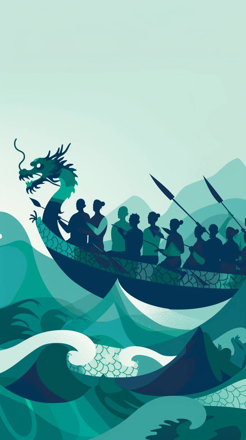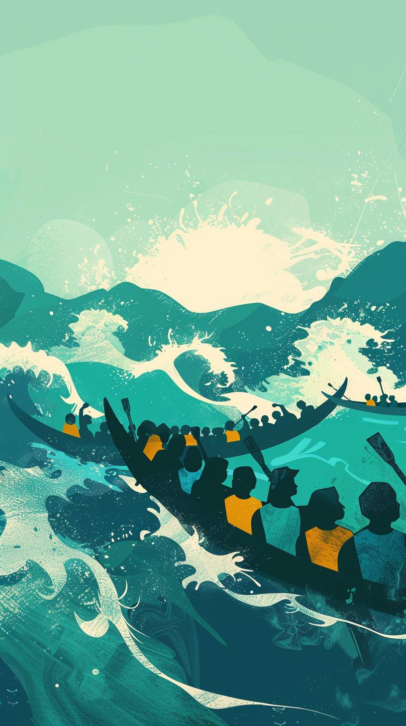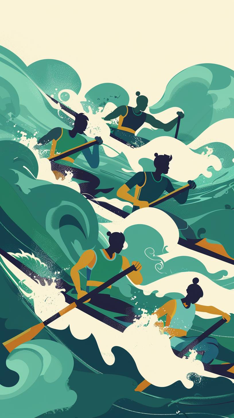 A group of people in the water for dragon boatracing, paddling with waves, blue and green tones, minimalist, design sense, illustration design --ar 9:16 --v 6.0