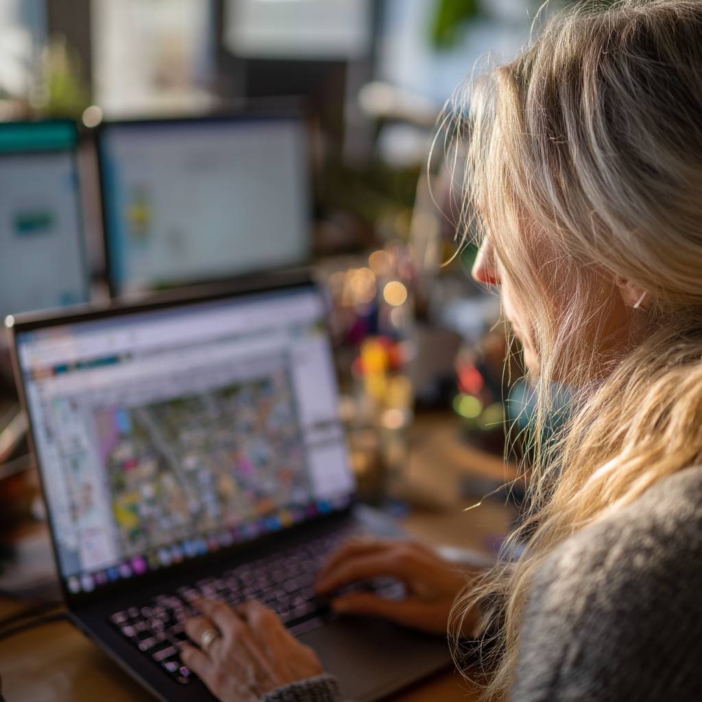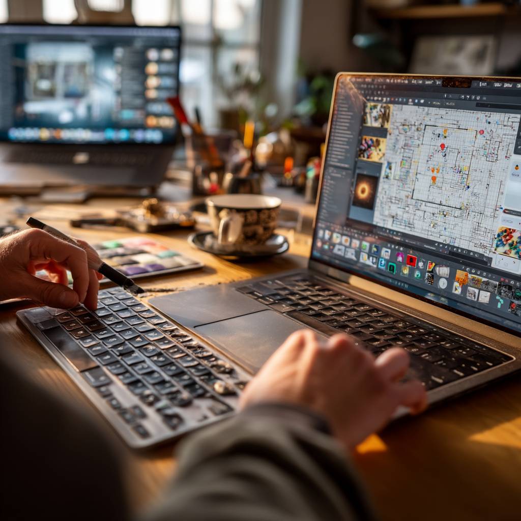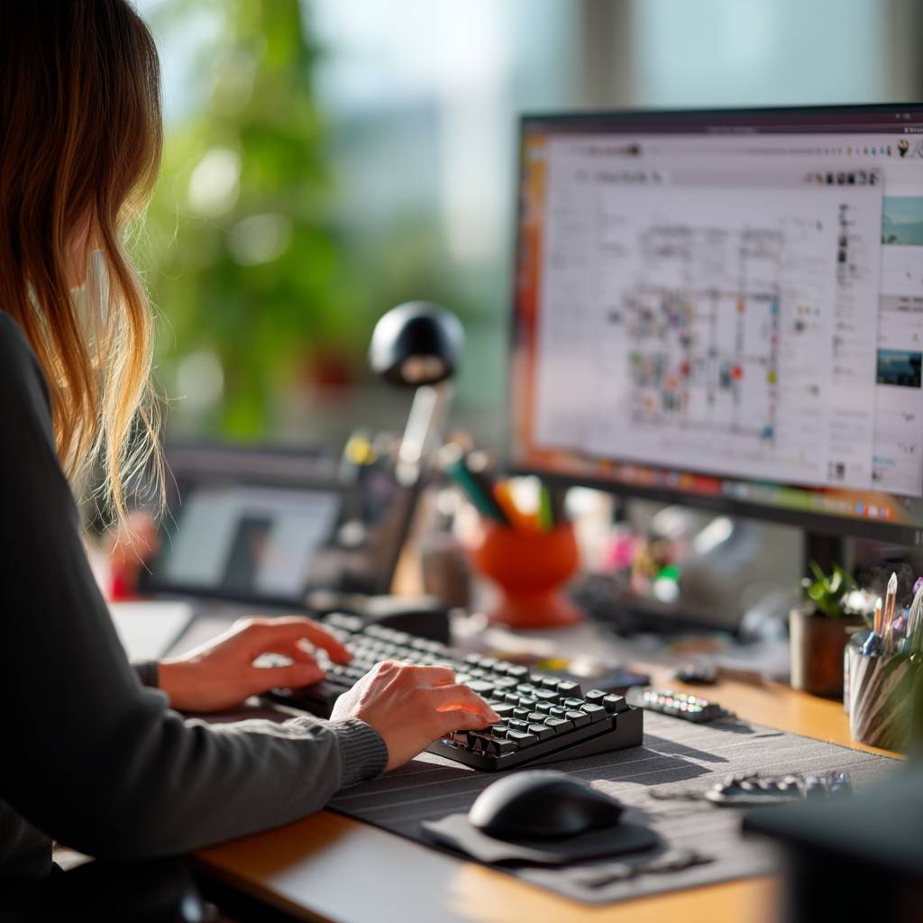 Over the shoulder shot, with most of the screen blocked by shoulder. A clean desktop or laptop screen with event planning CAD open. Hands on keyboard, mouse or stylus nearby. Natural daylight, tidy desk, minimal objects. Professional but not sterile warm, human, focused. detailed macro photography style, shallow depth of field, ultra sharp focus, shot on Canon EOS R5 with 100mm macro lens --v 7.0 --s 250