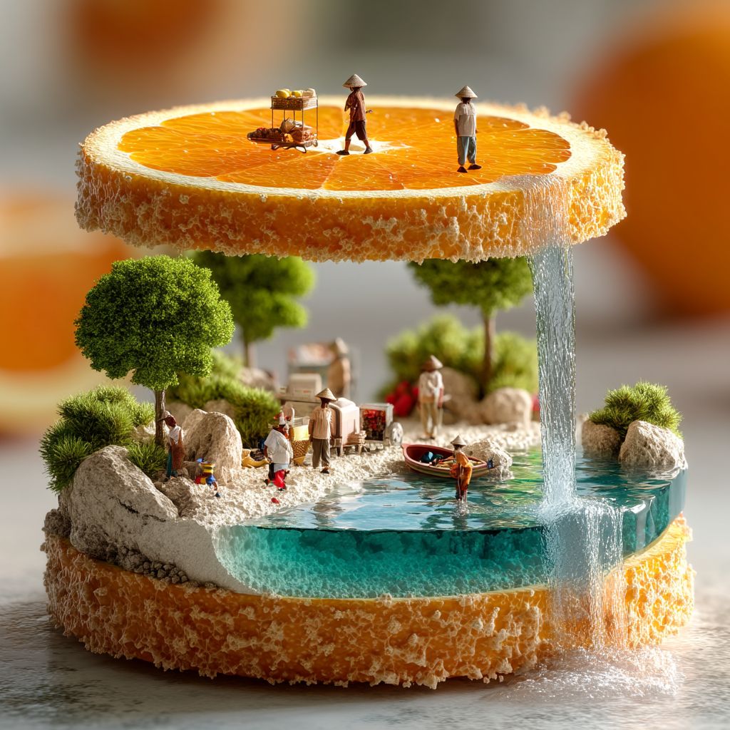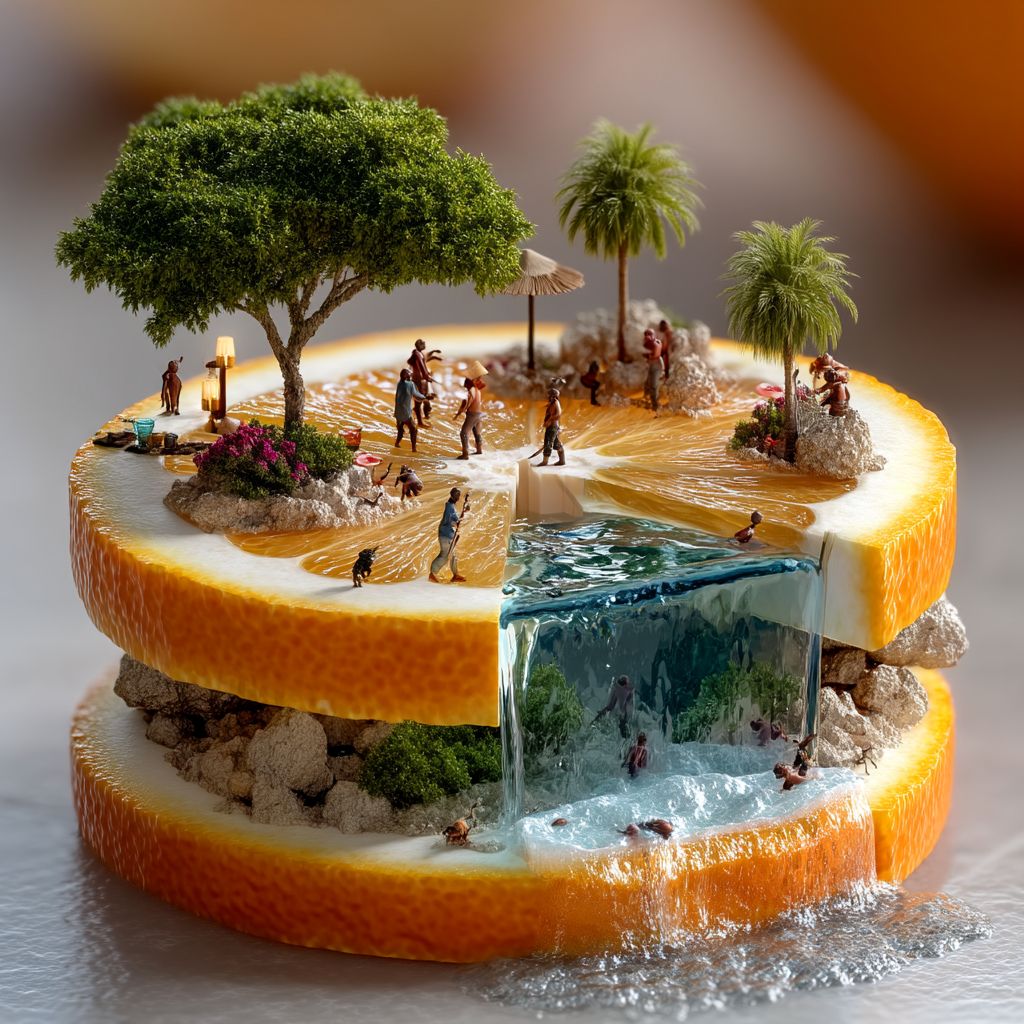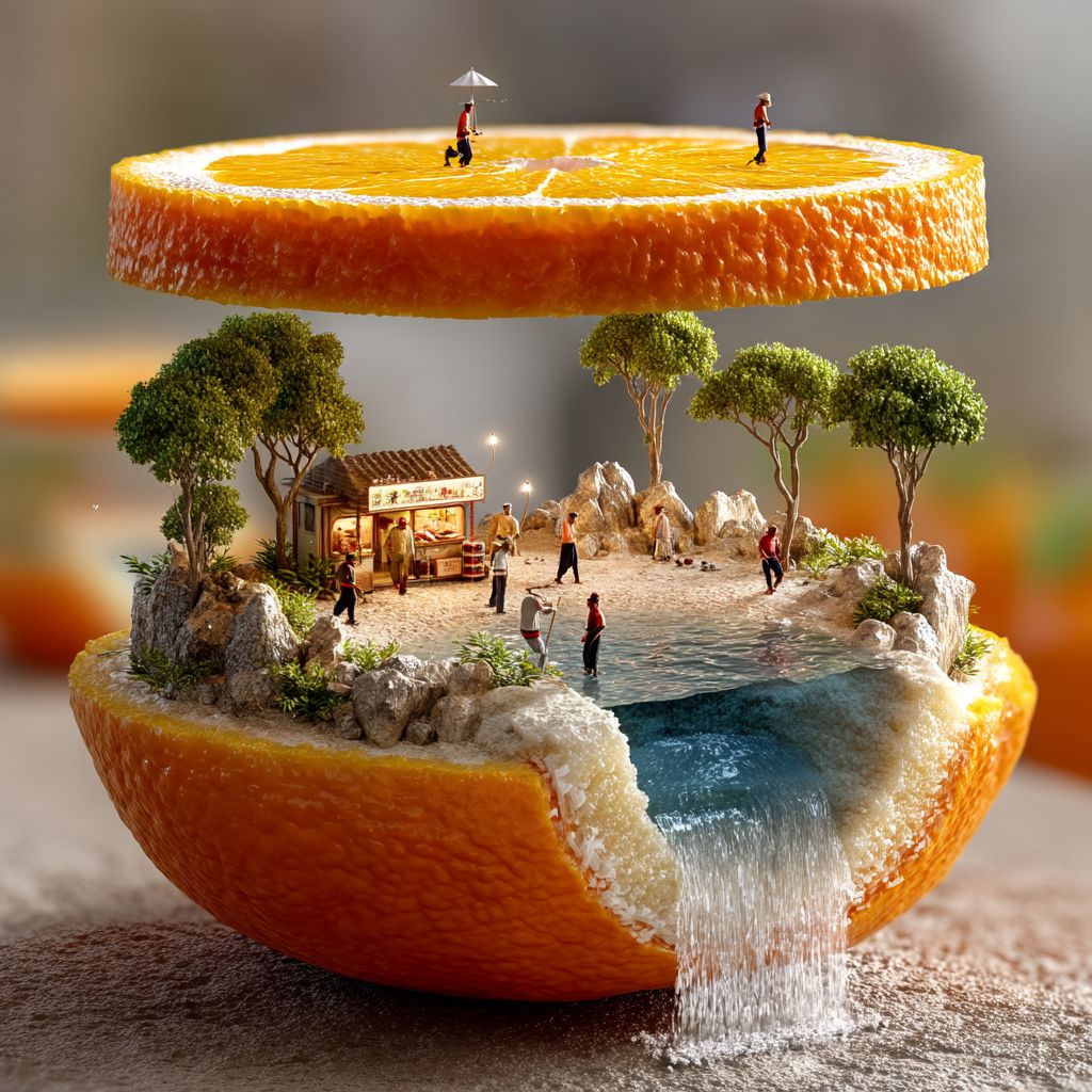 Una obra de arte digital surrealista que muestra una naranja partida con un paisaje en miniatura que incluye un estanque y figuras detalladas a su alrededor.