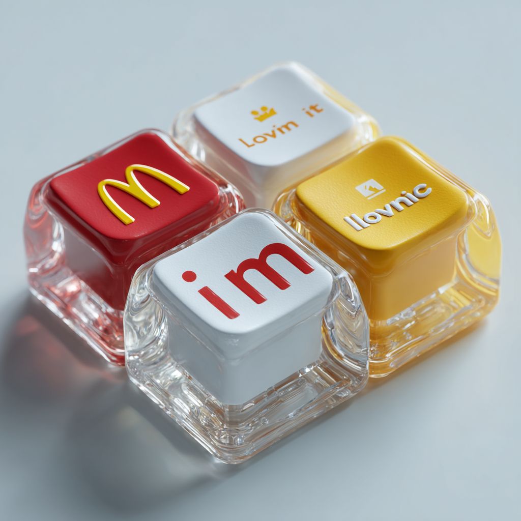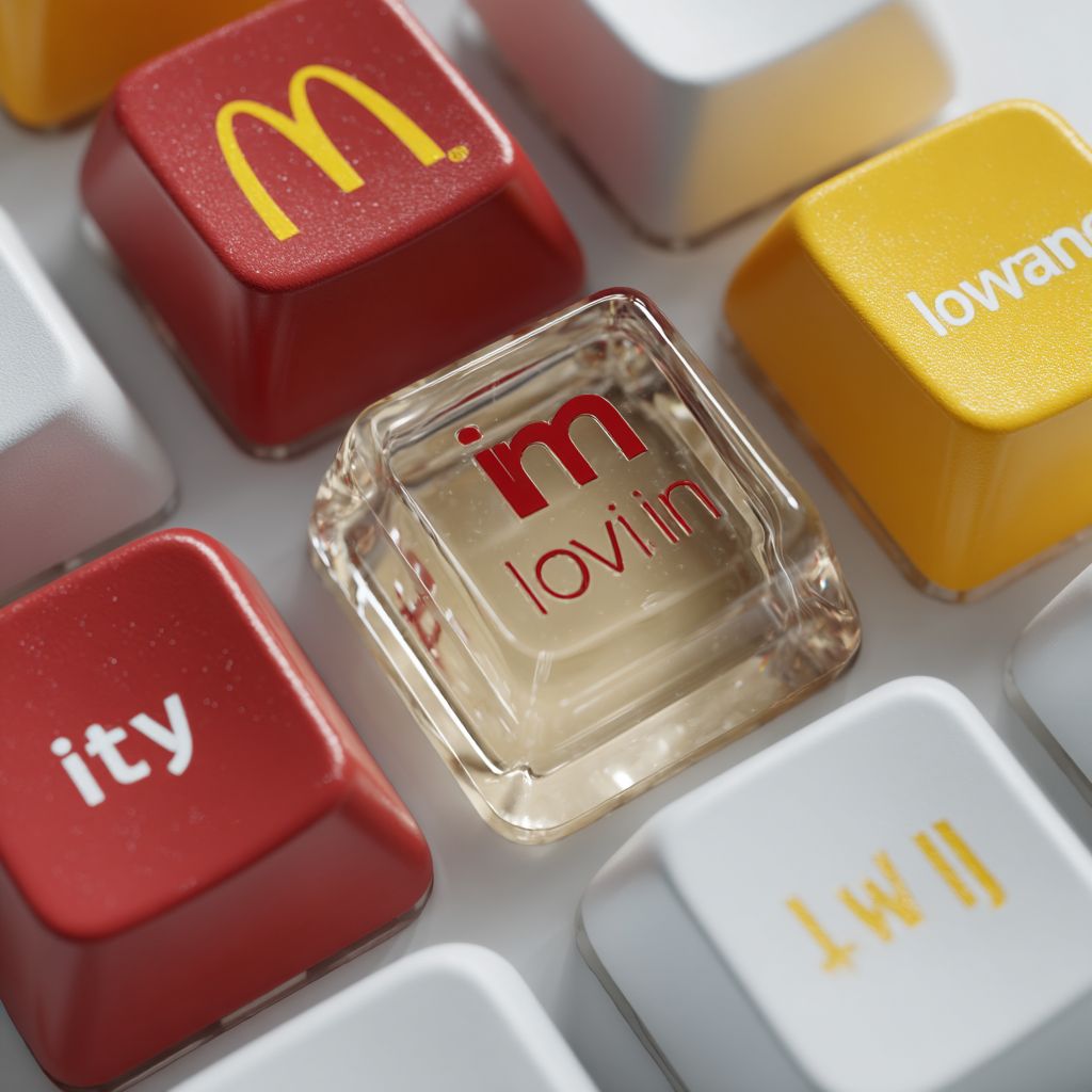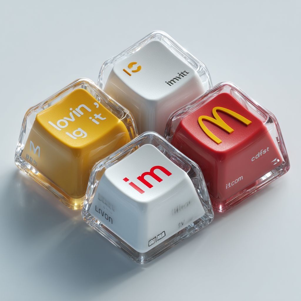 Render 3D ultra realista de cuatro teclas de teclado mecánico en una cuadrícula ajustada de 2x2, todas las teclas tocándose. Vista desde un ángulo isométrico. Una tecla es transparente con la palabra 'i’m' impresa en rojo. Las otras tres son de los colores de McDonald's: rojo, amarillo y blanco. Una tecla presenta el logo de los arcos dorados de McDonald's. Las otras dos dicen 'lovin' y 'it'. Textura de plástico realista, teclas redondeadas, sombras suaves, fondo limpio de gris claro.