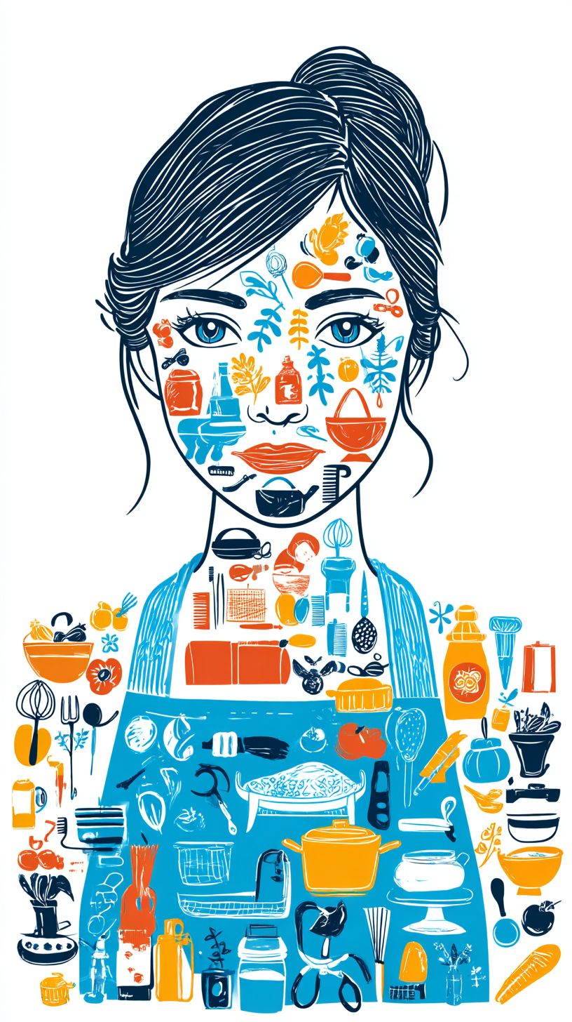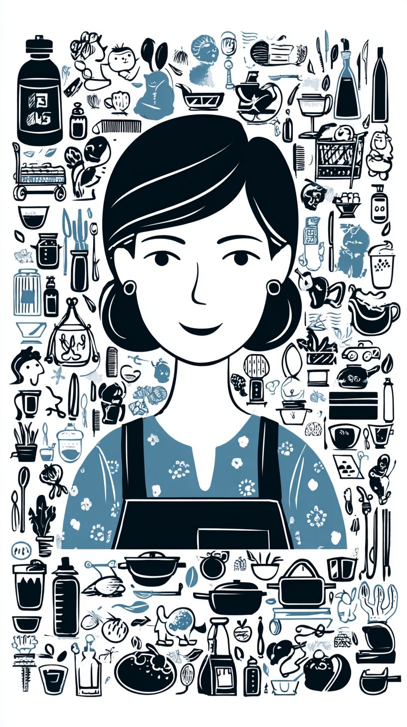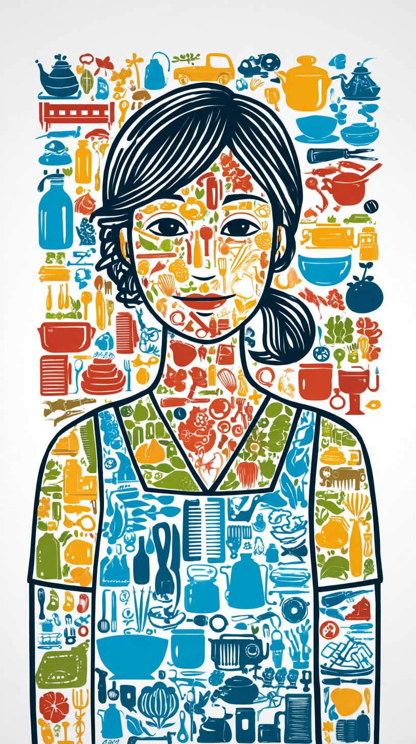hand-drawn vector illustrations forming an icon Collage portrait of a mother, close up shot, Each element is symbolically integrated into the composition: a baby bottle, cradle, apron, comb, medicine box, storybook, shopping bag, cookware (pots, bowls, ladles, chopsticks), and sewing kit, icon collage portrait, --ar 9:16 --profile bjmztj6 --v 7.0 --raw