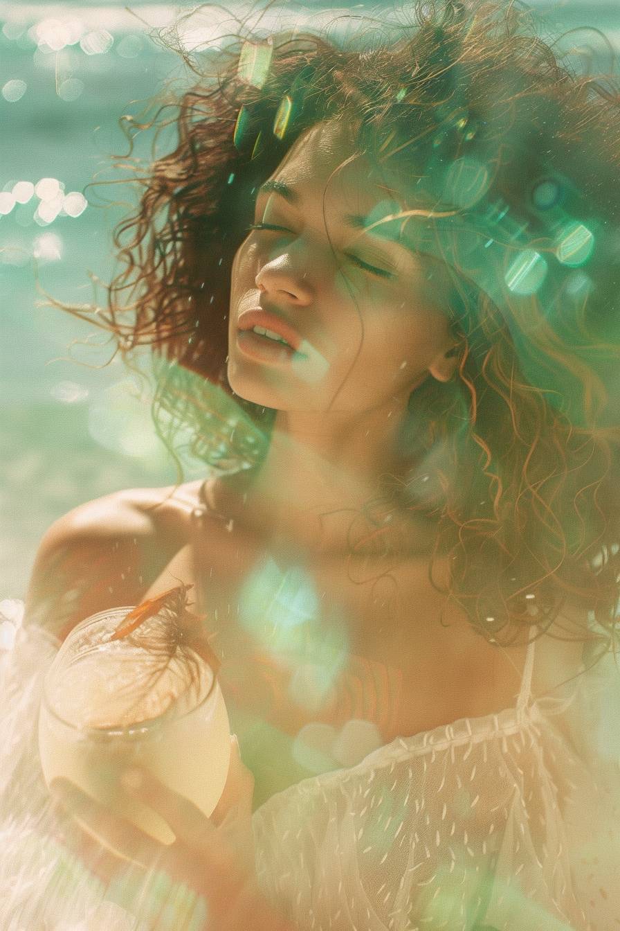 Dreamy core abstract, beautiful woman at a beach resort in summer, with a gentle sea breeze. She enjoys a blissful summer vacation, holding a refreshing coconut drink. The background showcases a serene beach with soft waves and golden sand. The scene is enchanting and dreamy. --ar 2:3 --style raw --v 6.0