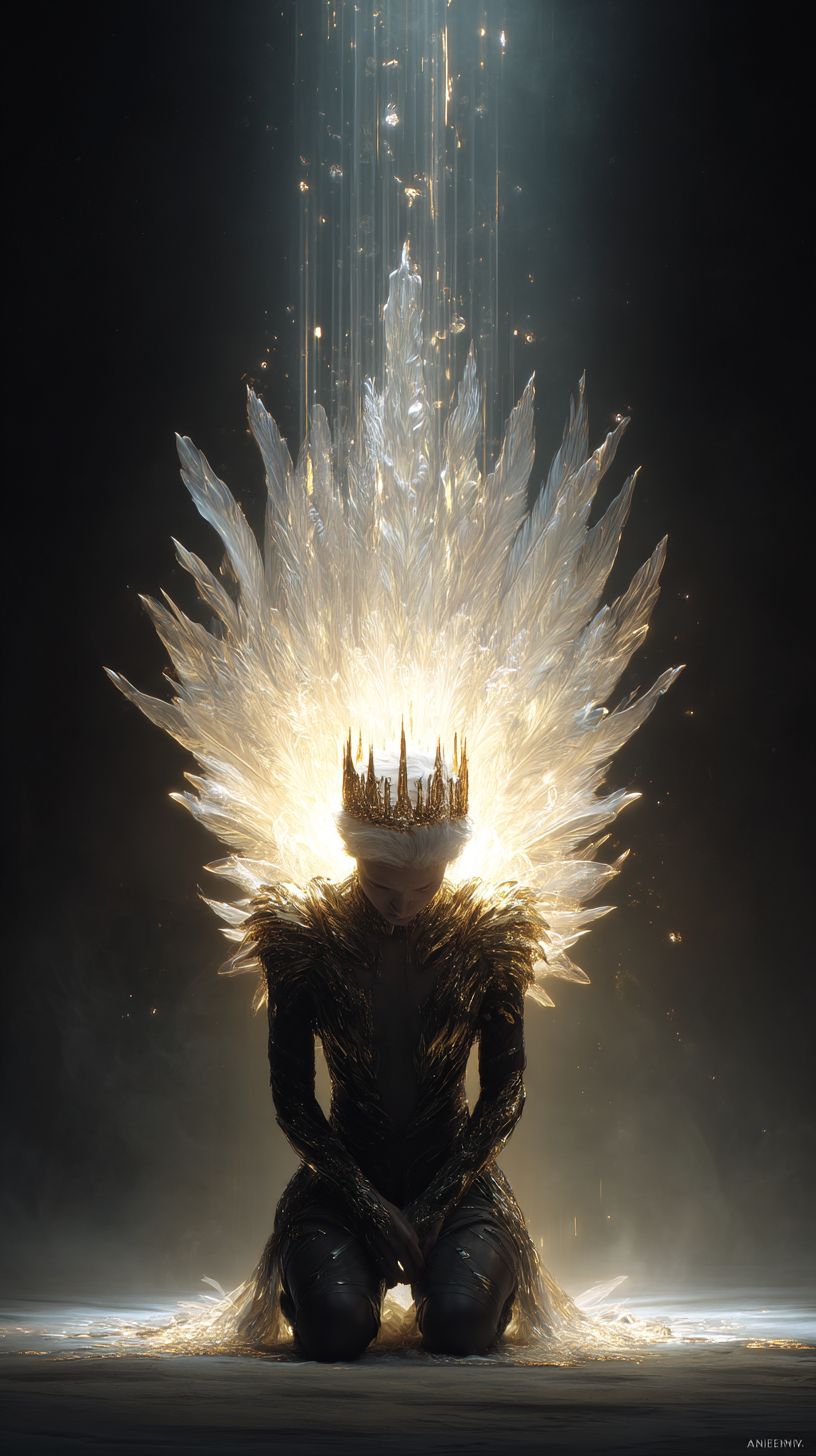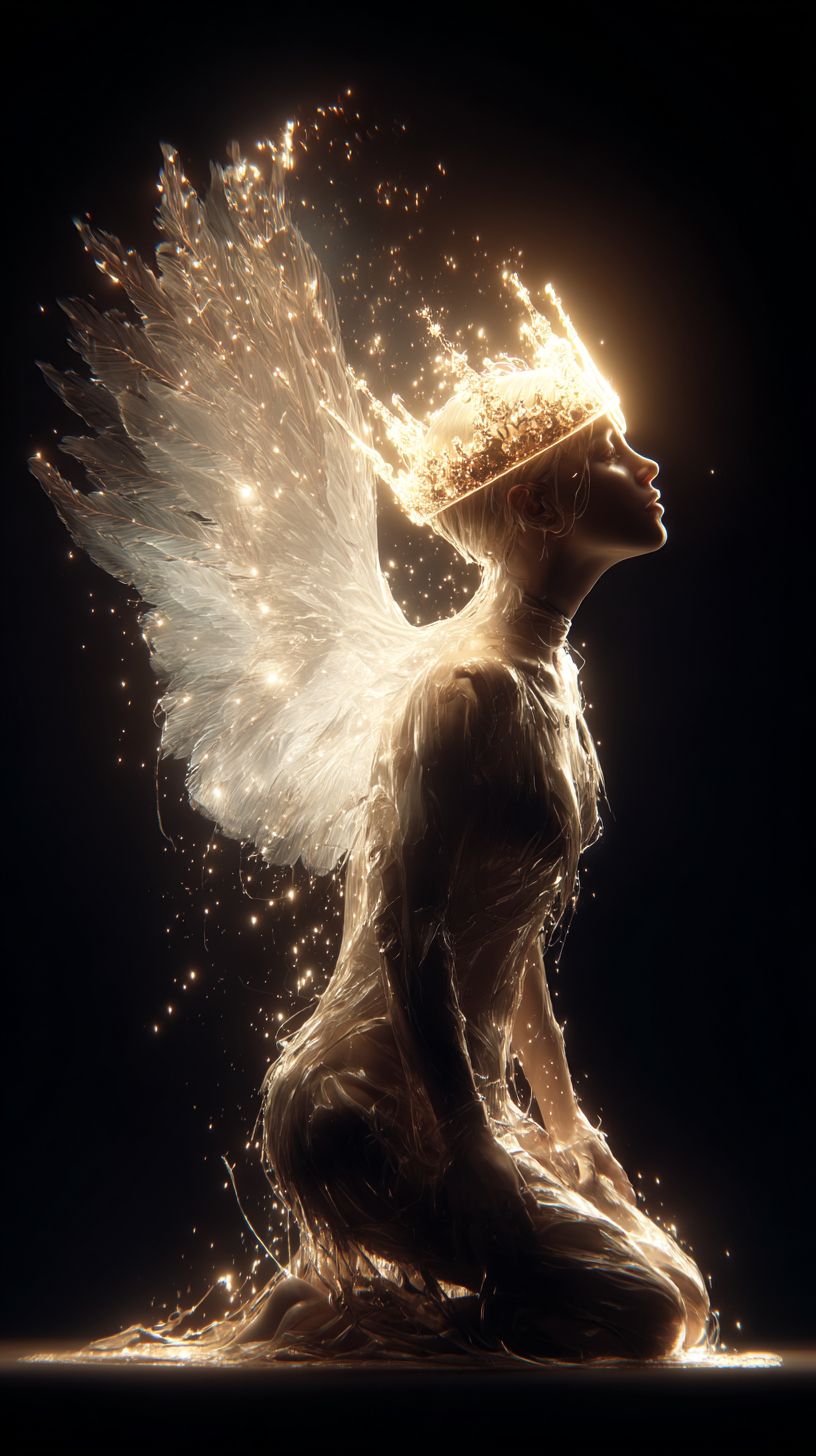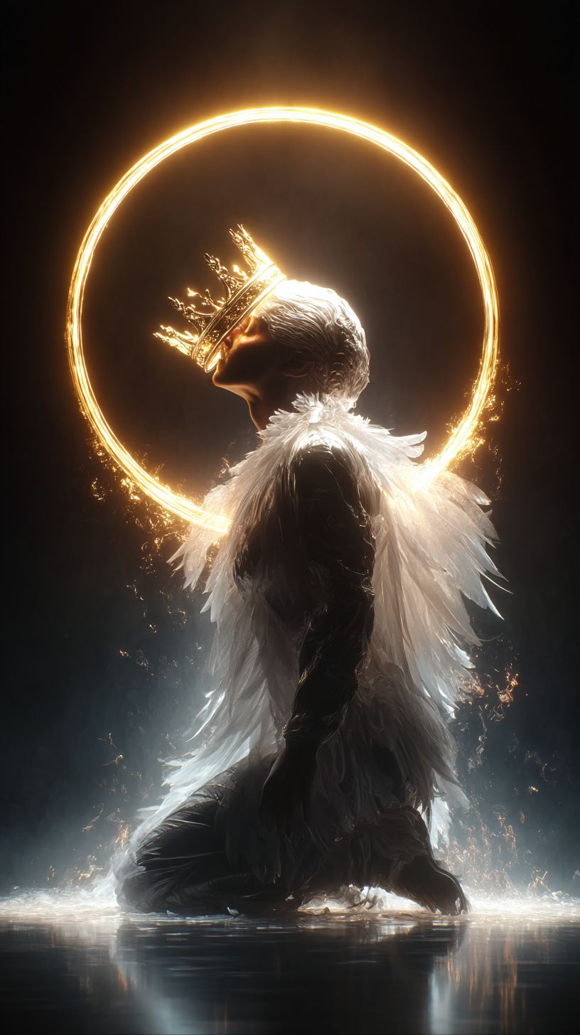 surreal portrait of a figure kneeling beneath a crown made of glowing light, visibly heavy on their head. Their back glows from the strain, and soft feathers fall from their shoulders as if they were wings. Black background, golden-white glow, symbolism of unseen burdens in cinematic 8K realism, built for metallic brilliance --ar 9:16 --profile 75lnyii --stylize 250 --v 7.0
