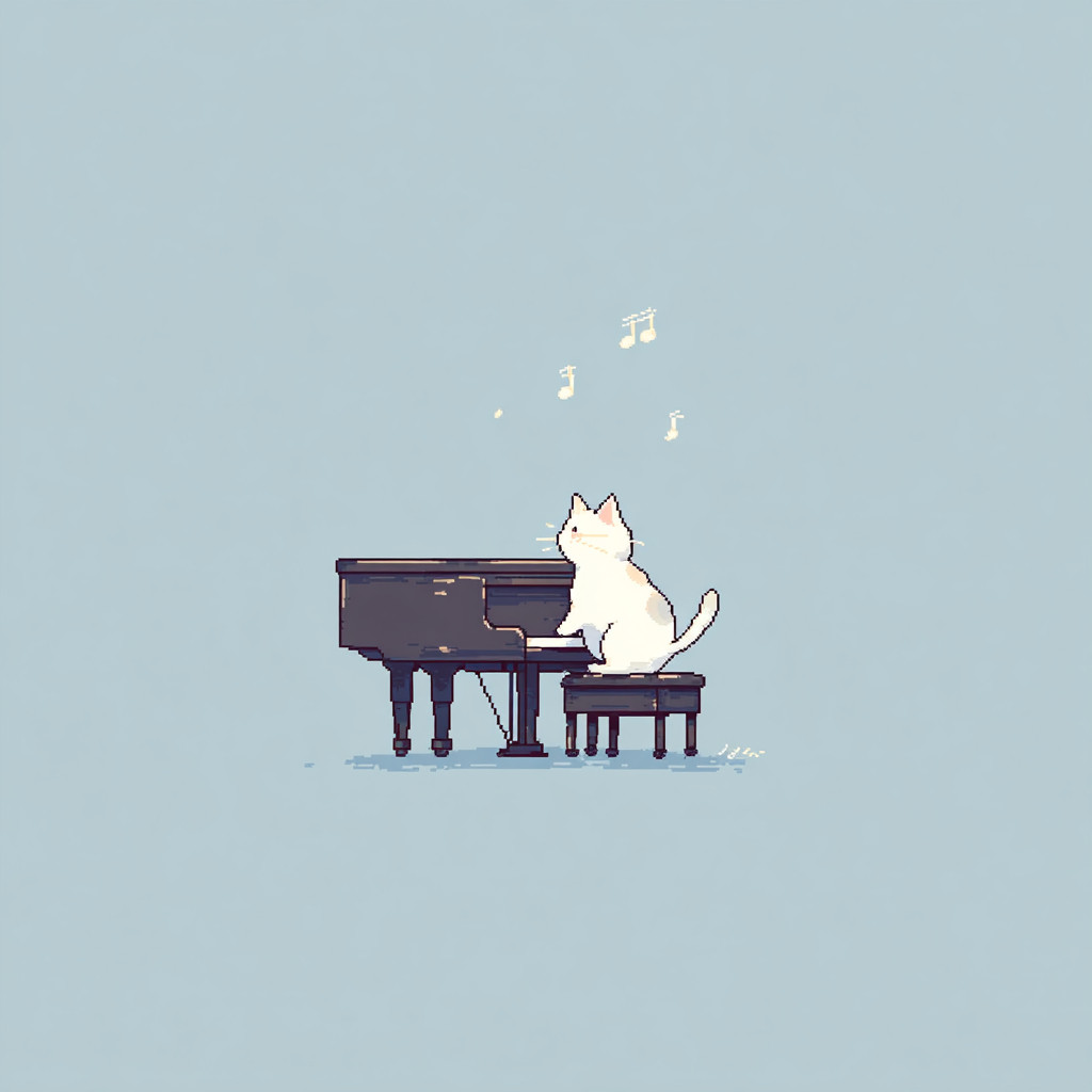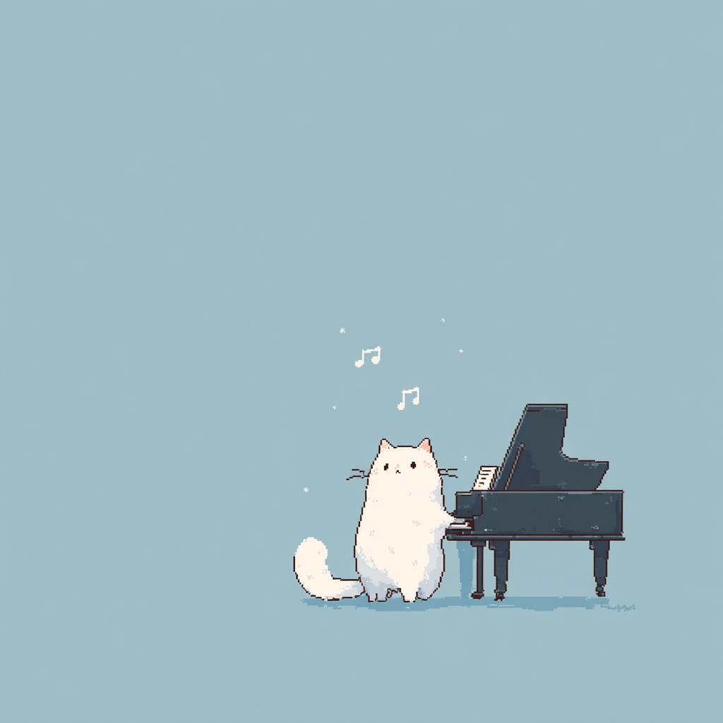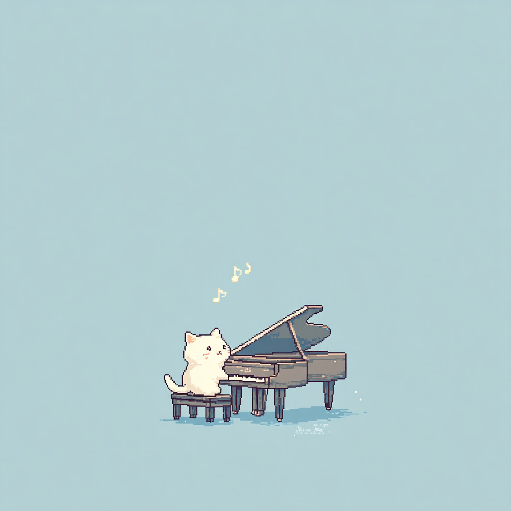 cat playing a grand piano, simple anime style, minimalist, whiskers, 8-bit pixel art style, pale blue background, 3 music notes floating above --profile 5lcte4a --v 7.0 --s 250