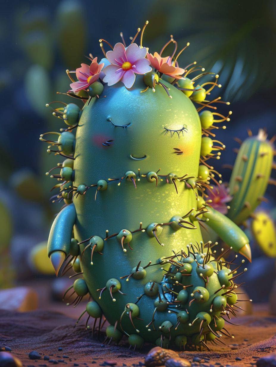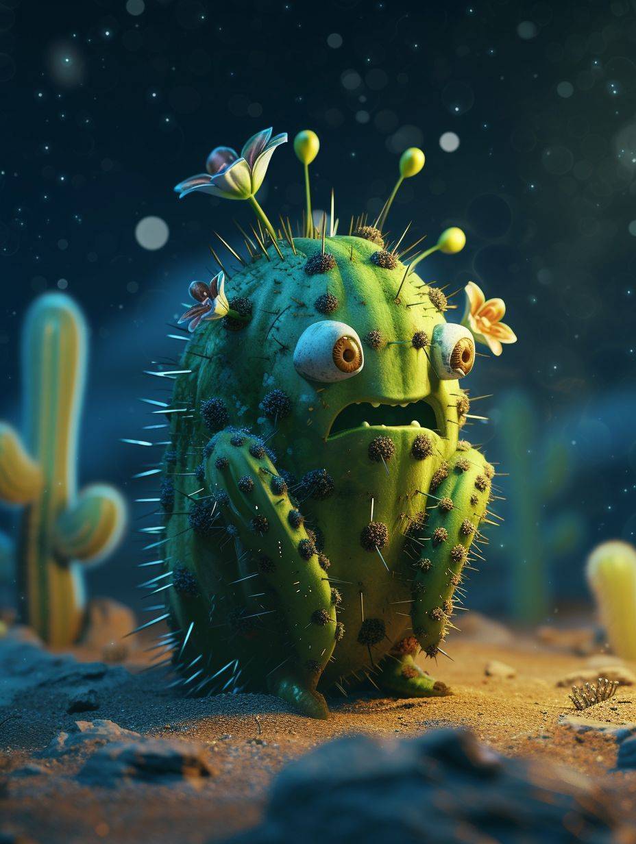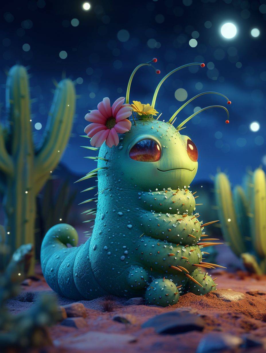cute roly-poly creature with cactus spikes and a flowery tail, 3d print illustration, smooth animation, desert oasis at night scenery --ar 3:4 --v 6