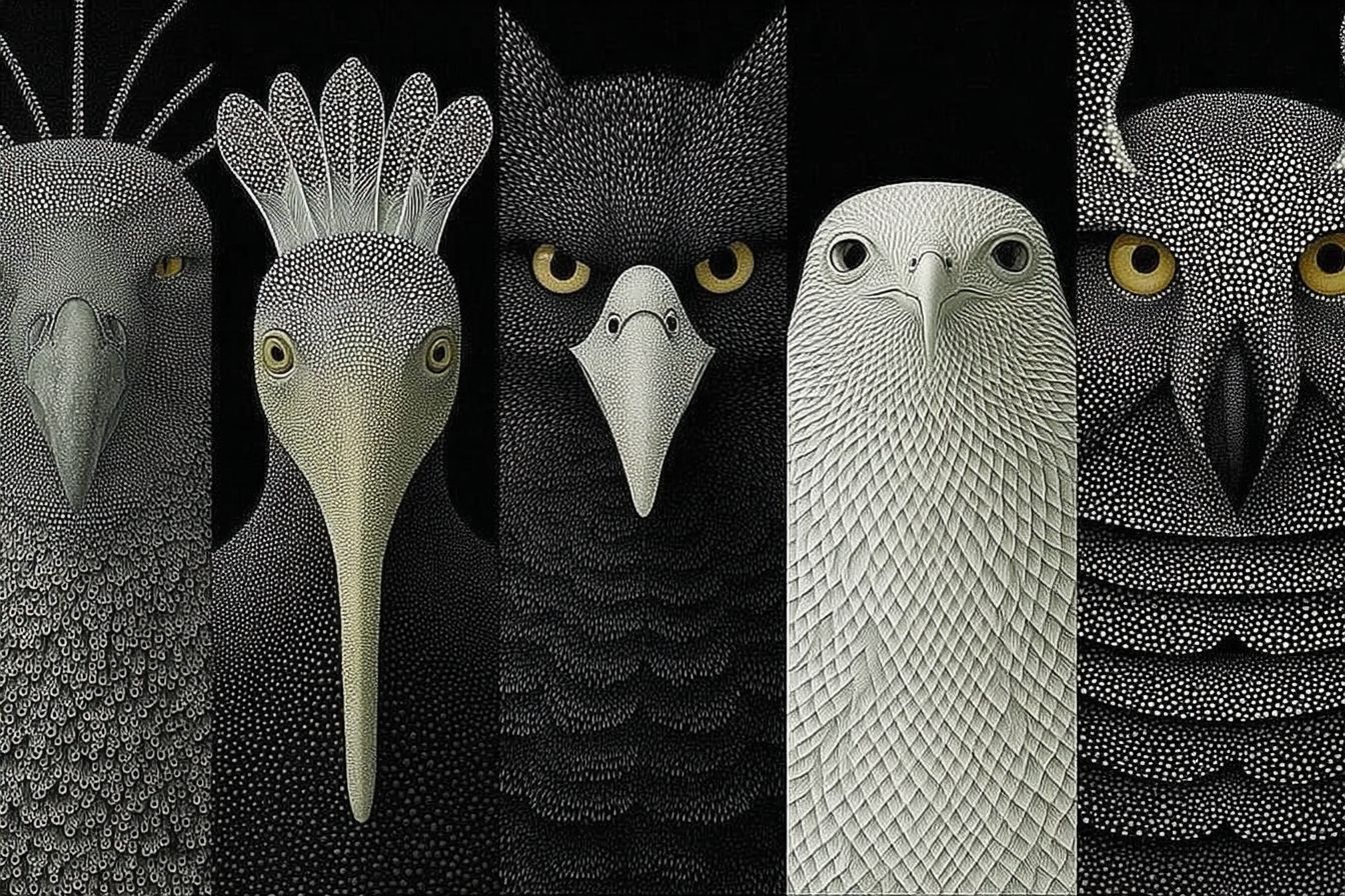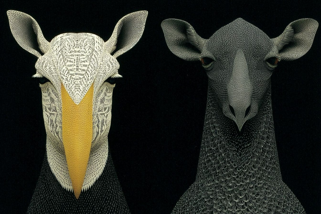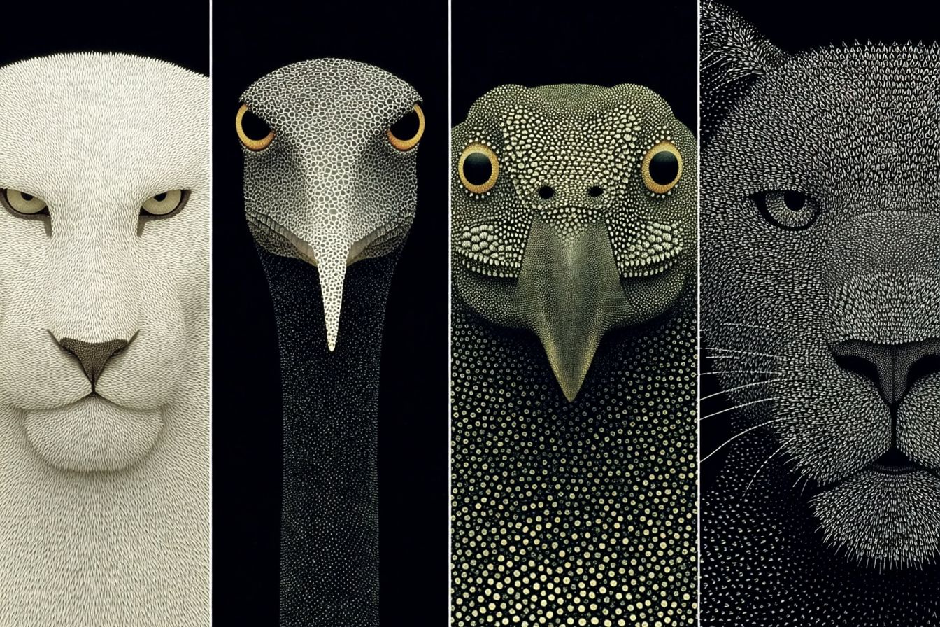 Animales exóticos y surrealistas en la portada de una revista en blanco y negro