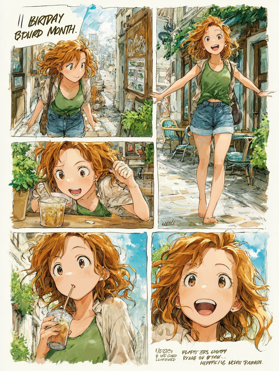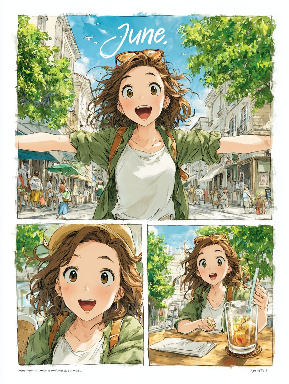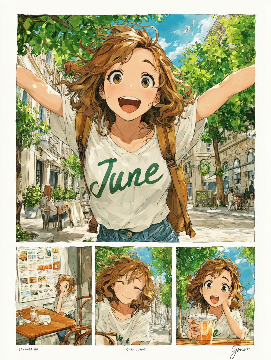 4-panel manga comic titled "June Birthday Month Summer Mood", cute anime style, 4-koma format, warm summer color palette with bright blues, greens and golden sunlight, first panel shows young girl walking on sunny street discovering June calendar in shop window with moment of realization, urban summer background, second panel shows same girl stopping to stretch arms wide under warm sunlight with happy smile, enjoying summer warmth, third panel shows girl sitting at outdoor cafe table with iced drink, planning happily while enjoying cold beverage, summer terrace setting, fourth panel shows girl walking under green tree shade humming cheerfully, relaxed and content expression, dappled sunlight through leaves, emotional progression from discovery to joy to planning to contentment, summer atmosphere throughout, japanese 4-koma style with clean white borders, --ar 3:4 --stylize 750 --v 7.0