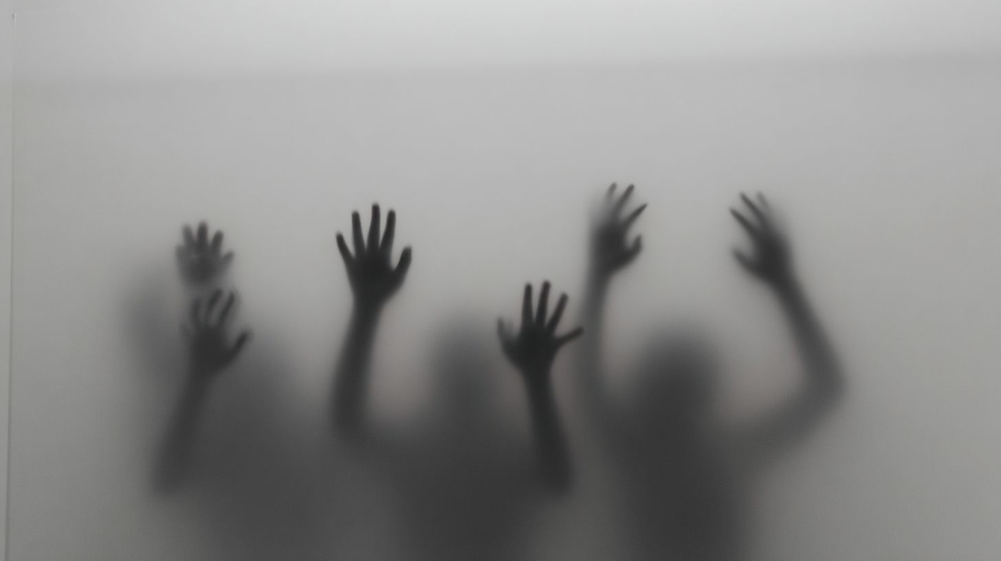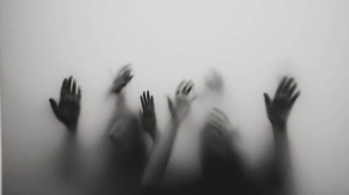 Una foto en blanco y negro borrosa muestra las manos de varias mujeres detrás de un vidrio brumoso, creando una atmósfera misteriosa