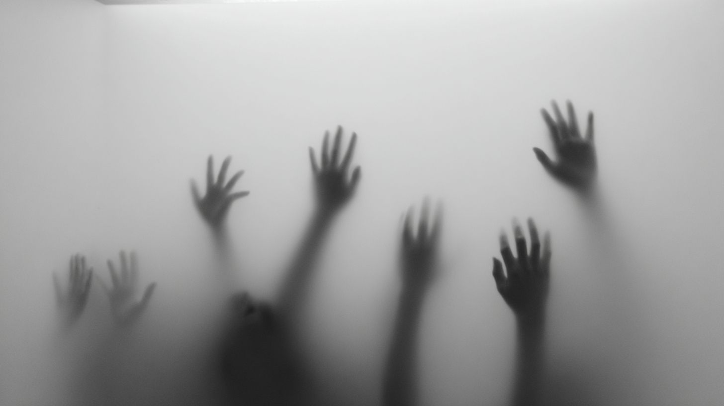 Una foto borrosa en blanco y negro de varias manos de mujeres detrás de un vidrio empañado, creando una atmósfera inquietante. El fondo es una pared blanca simple que añade a la sensación de misterio. Un sutil destello de luz se puede ver a través de la neblina alrededor de sus palmas, sugiriendo que pueden sostener algo oscuro o siniestro. Esta escena crea un estado de ánimo inquietante que deja espacio para la interpretación de los espectadores. El enfoque está en las manos, no en la cara.