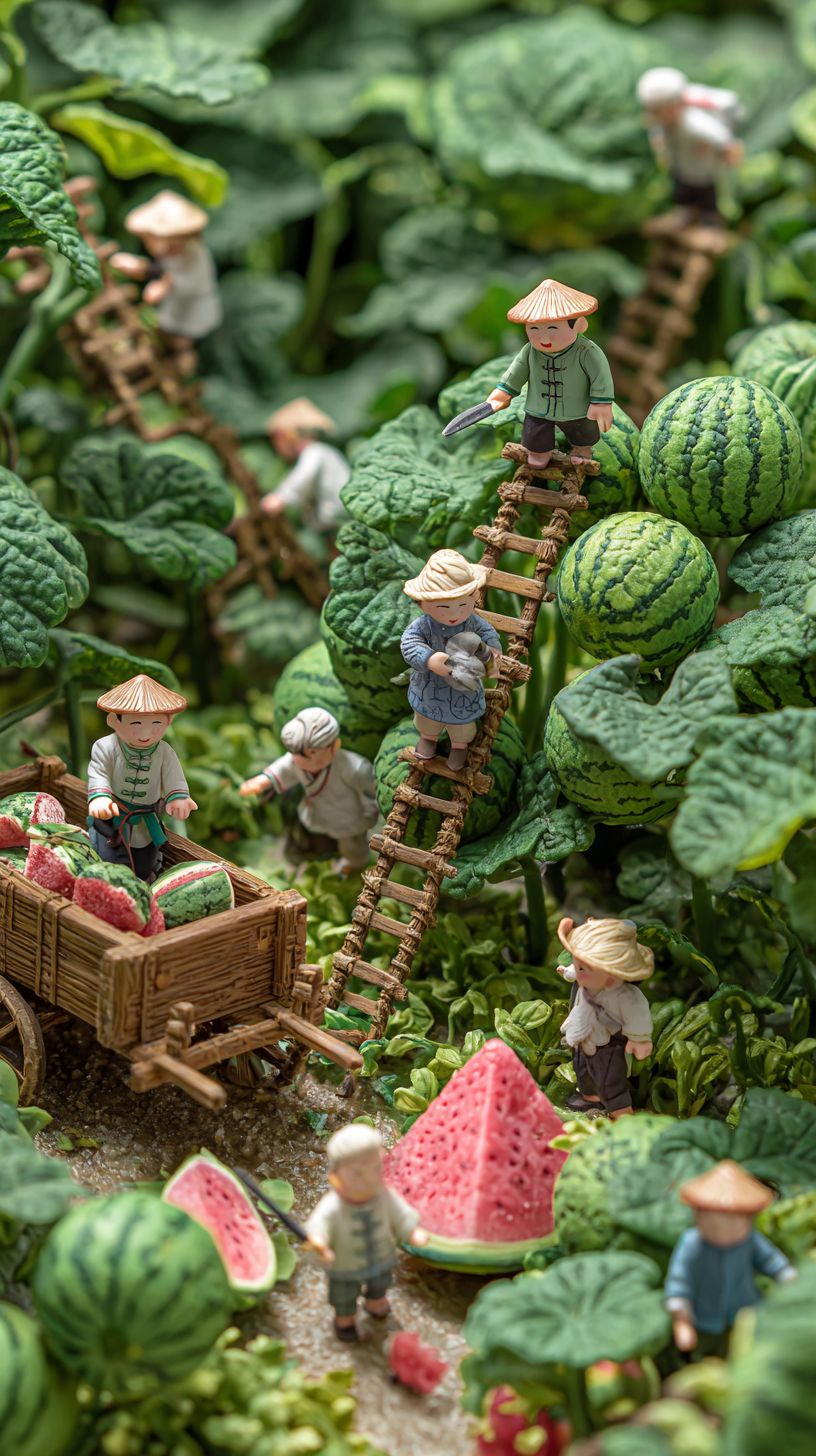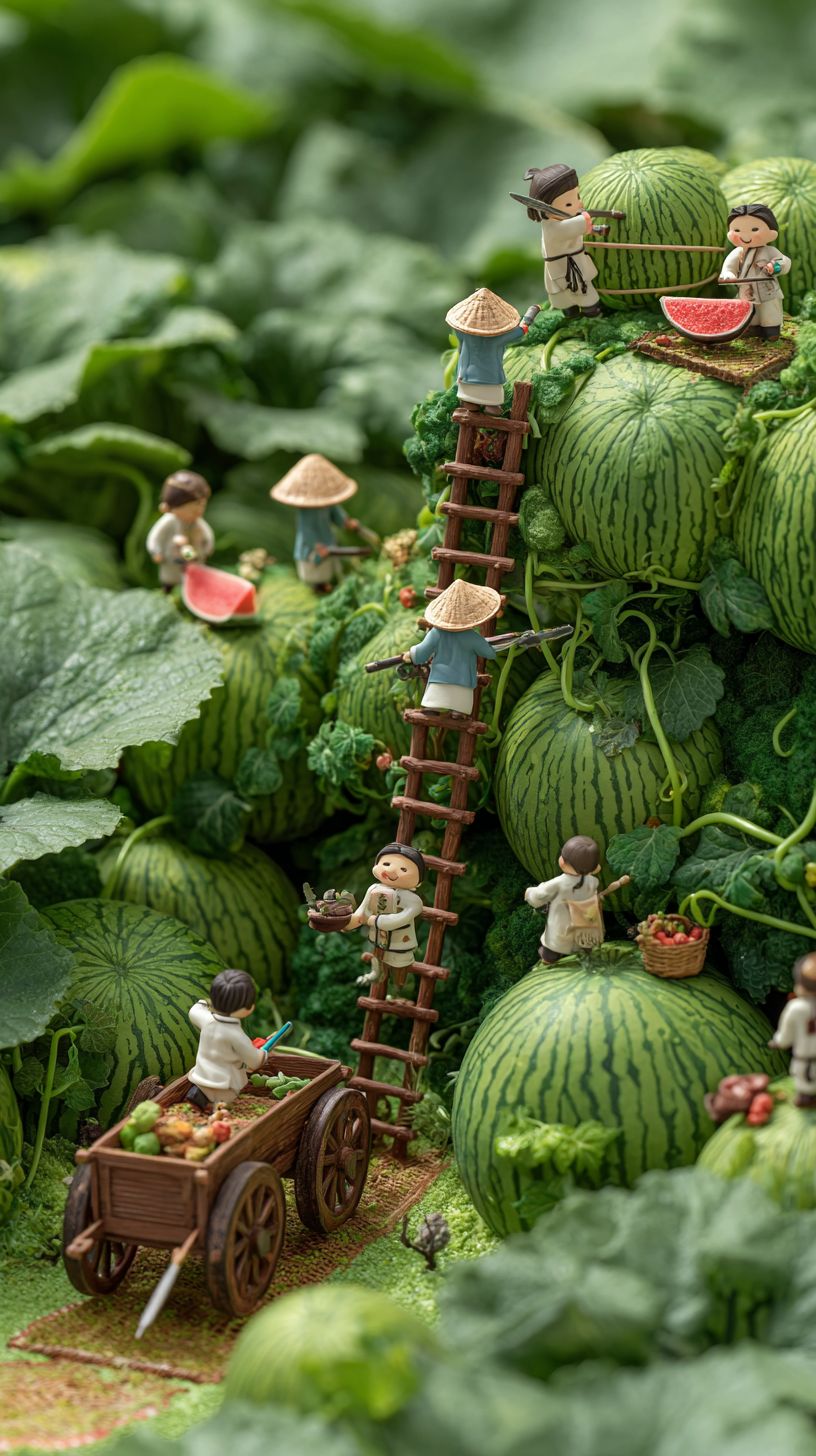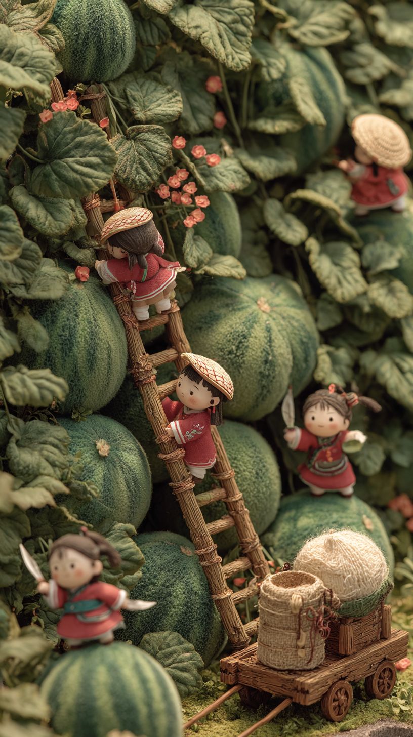 En un paisaje en miniatura, hay una docena de adorables figuritas vestidas con Hanfu tradicional, recogiendo sandías en un vasto campo de sandías. Algunas de las pequeñas figuras están subiendo por las vides de sandía con escaleras, mientras que otras están de pie junto a las vides, cortándolas con cuchillos. Una pequeña figura está animando desde el suelo, gritando palabras de aliento, y otra está empujando un carrito de madera vacío. El fondo está lleno de exuberantes plantas de sandía, cargadas con enormes sandías. Las acciones de las pequeñas figuras son específicas y sus roles están claramente definidos.