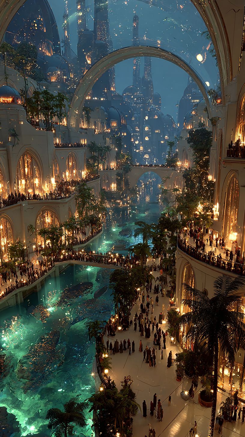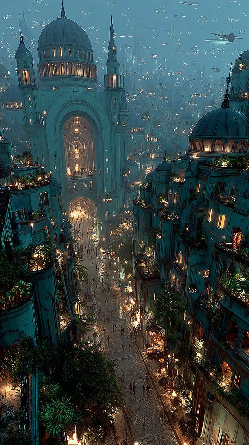 ultra fine cinematic matte view photography of the a night Coruscant palace plaza by Nathaniel Merz, beautiful vegetable, volumetric lighting, space traffic, vibrant colours --ar 9:16 --stylize 450 --v 7.0