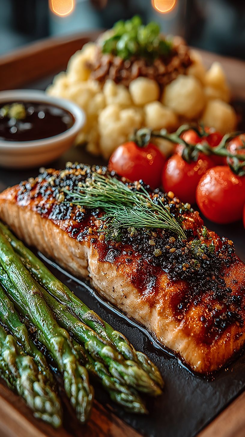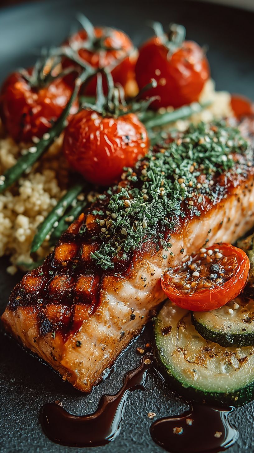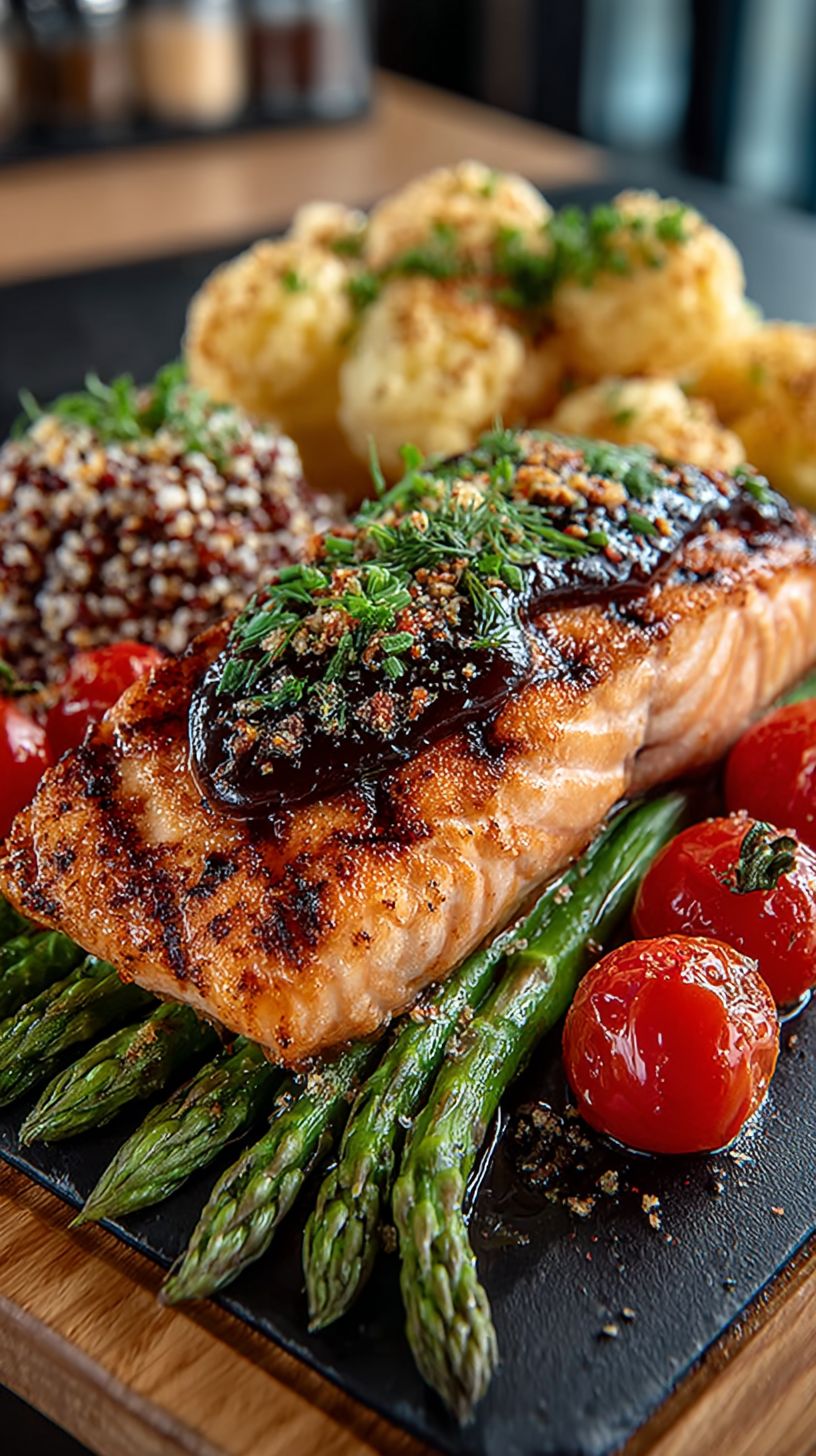 Healthy dish of grilled salmon, fresh vegetables, and whole grains on a modern kitchen counter, clean eating concept, high quality photo, shot on iPhone --ar 9:16 --s 750