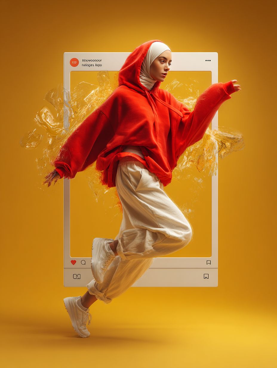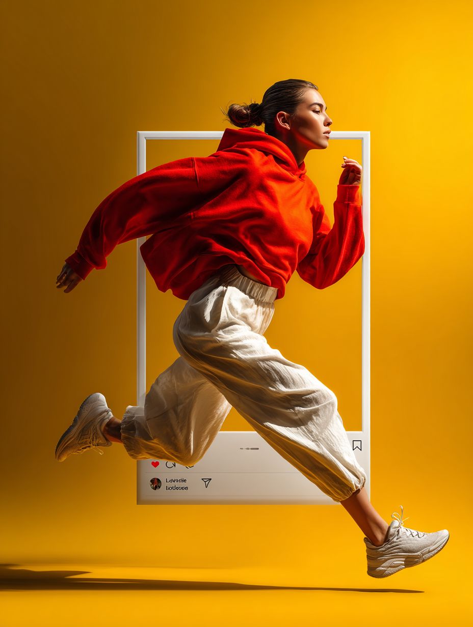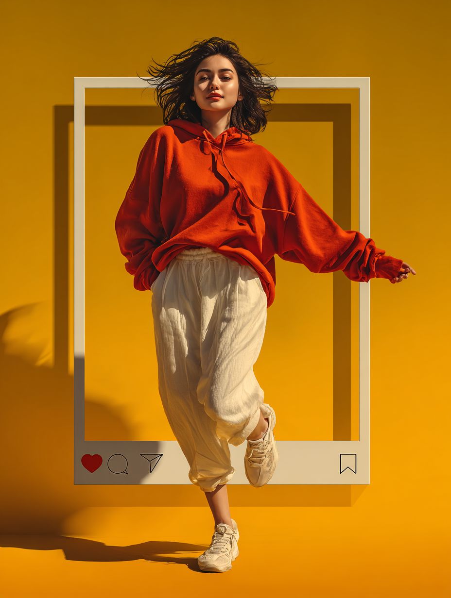Photorealistic digital illustration of a stylized social-media post featuring a clean white Instagram-style frame with username, likes, and caption bars. In the center, a woman in a bright red hoodie and cream trousers strides energetically to the right, her right leg and arm popping out of the frame into the viewer’s space. Behind her within the frame is a solid mustard-yellow background. Soft drop shadows beneath the figure and frame enhance the 3D pop-out effect. Crisp, even studio lighting highlights the textures of the clothing and the clean UI elements, creating a modern, playful composition. --chaos 15 --ar 3:4 --raw --profile 2hnuycz 9bfpx31 --stylize 140