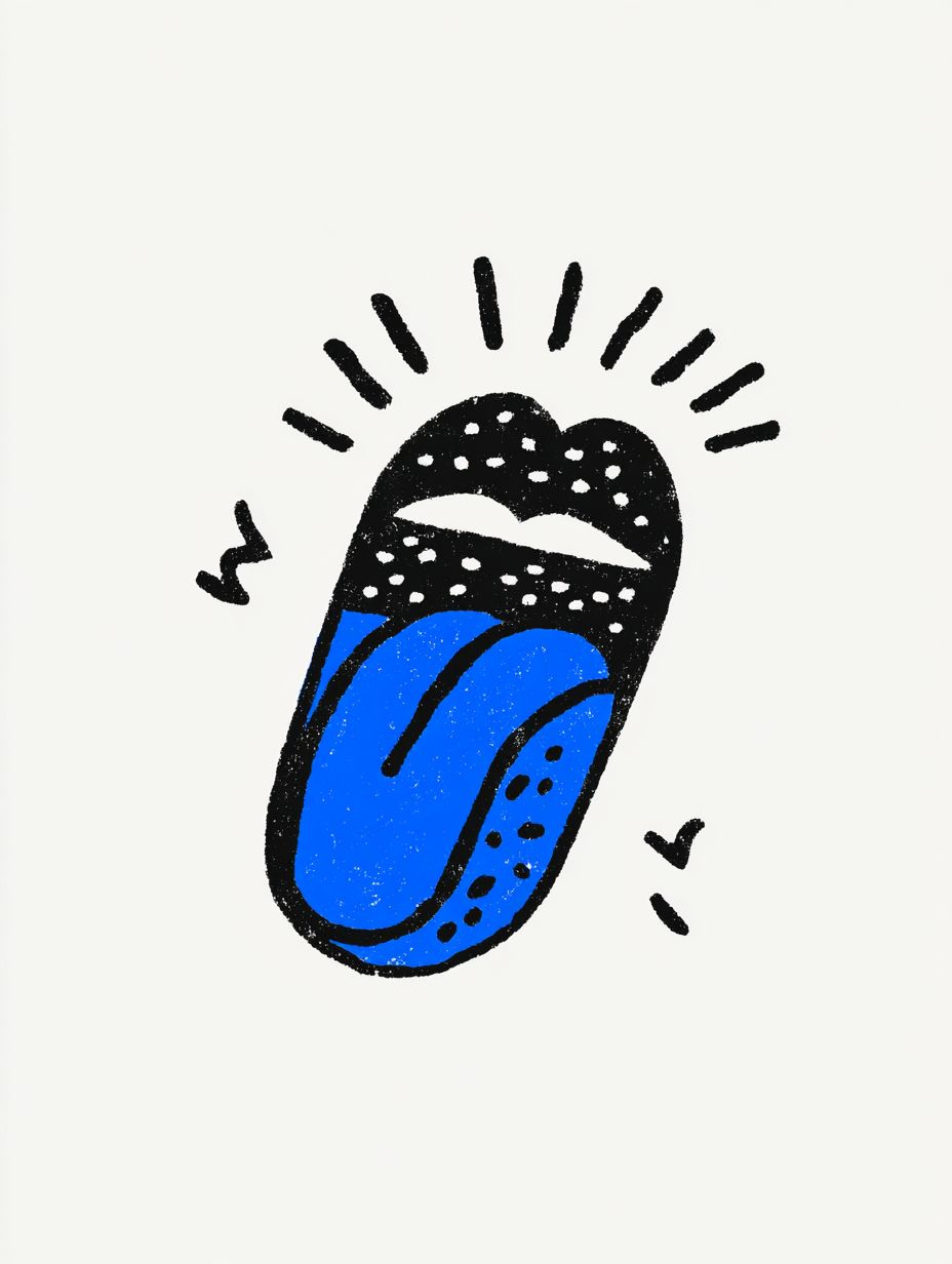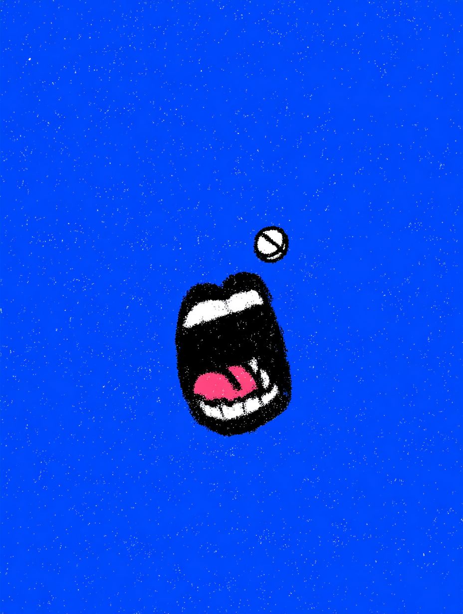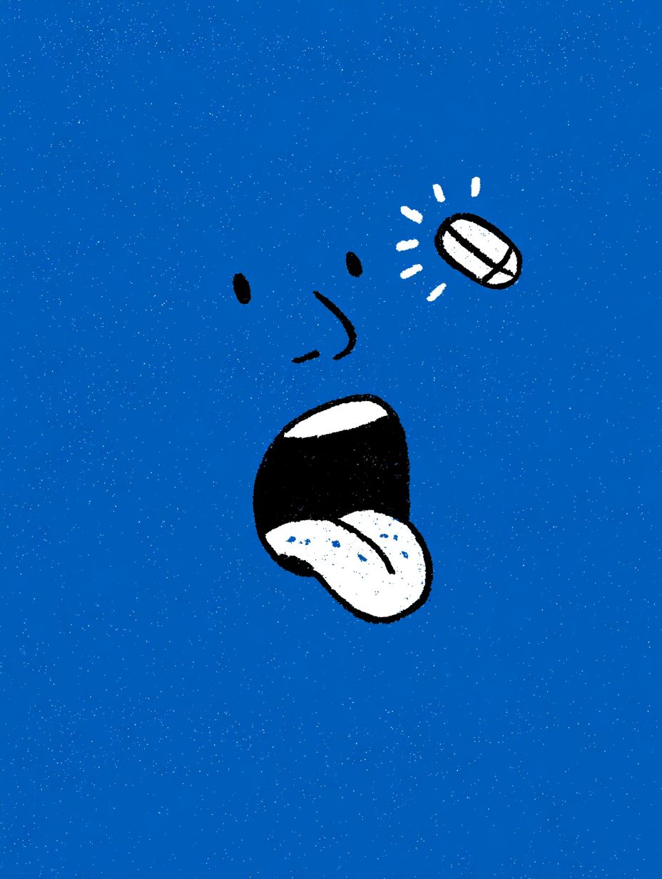 Una pastilla de medicina cae dentro de una boca abierta con la lengua afuera