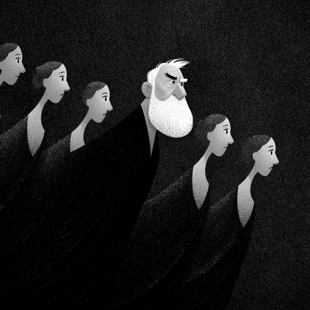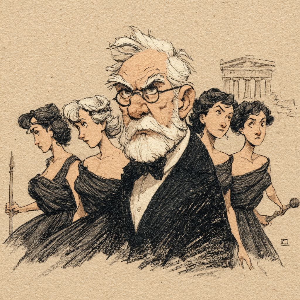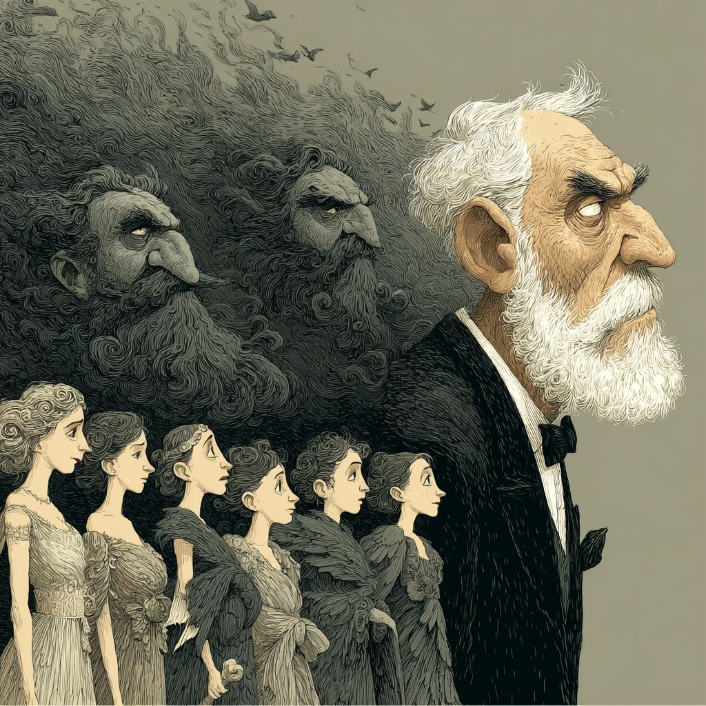 In the style of Edward Gorey: The 9 Greek muses being evicted from Mount Olympus by Zeus. Zeus looks like an angry, overweight, business man in his 80s. Clean shaven. Thin, neat, white hair, parted on the side. --s 750