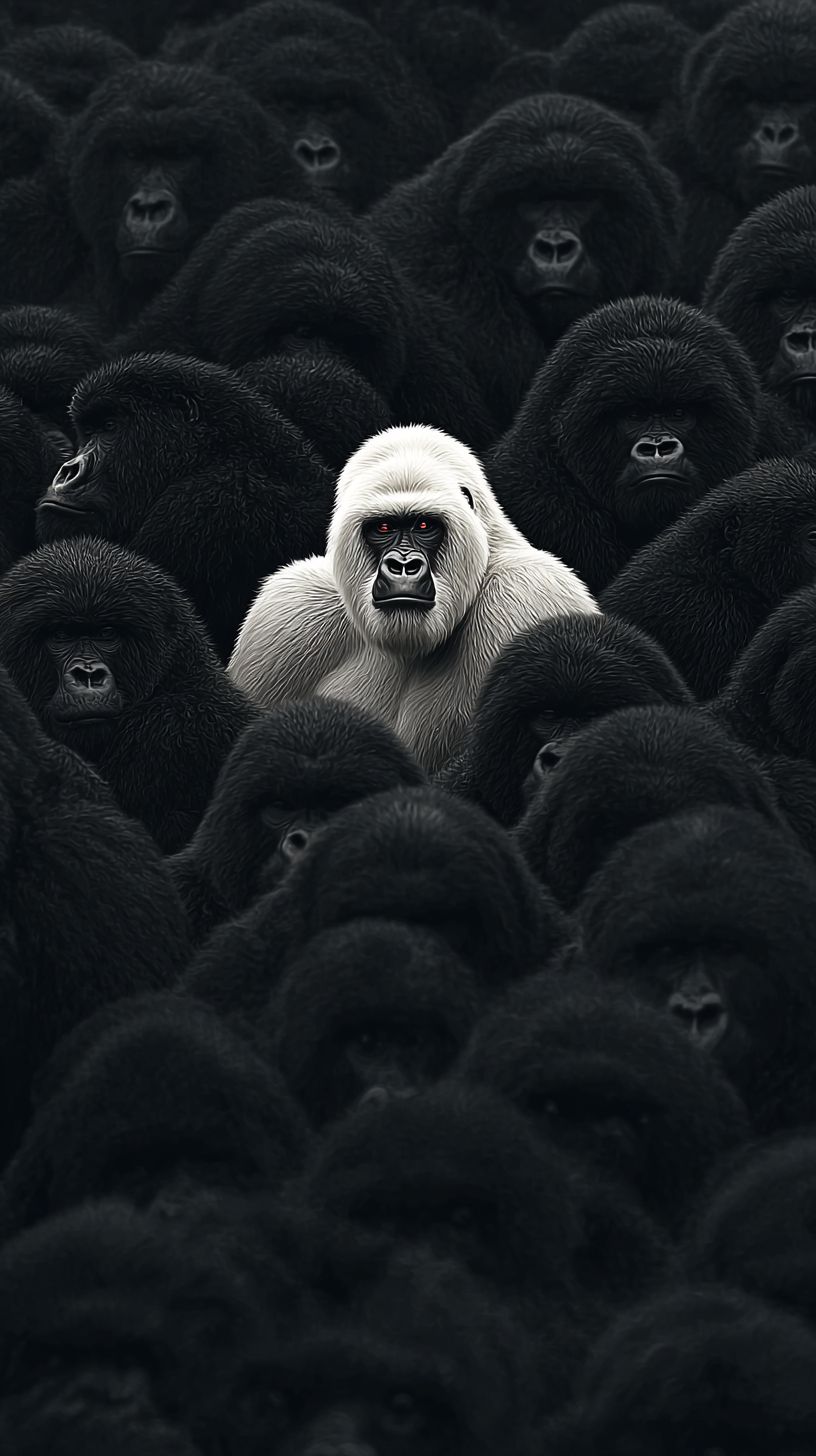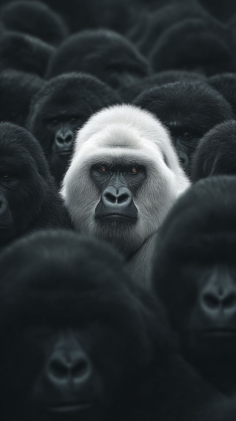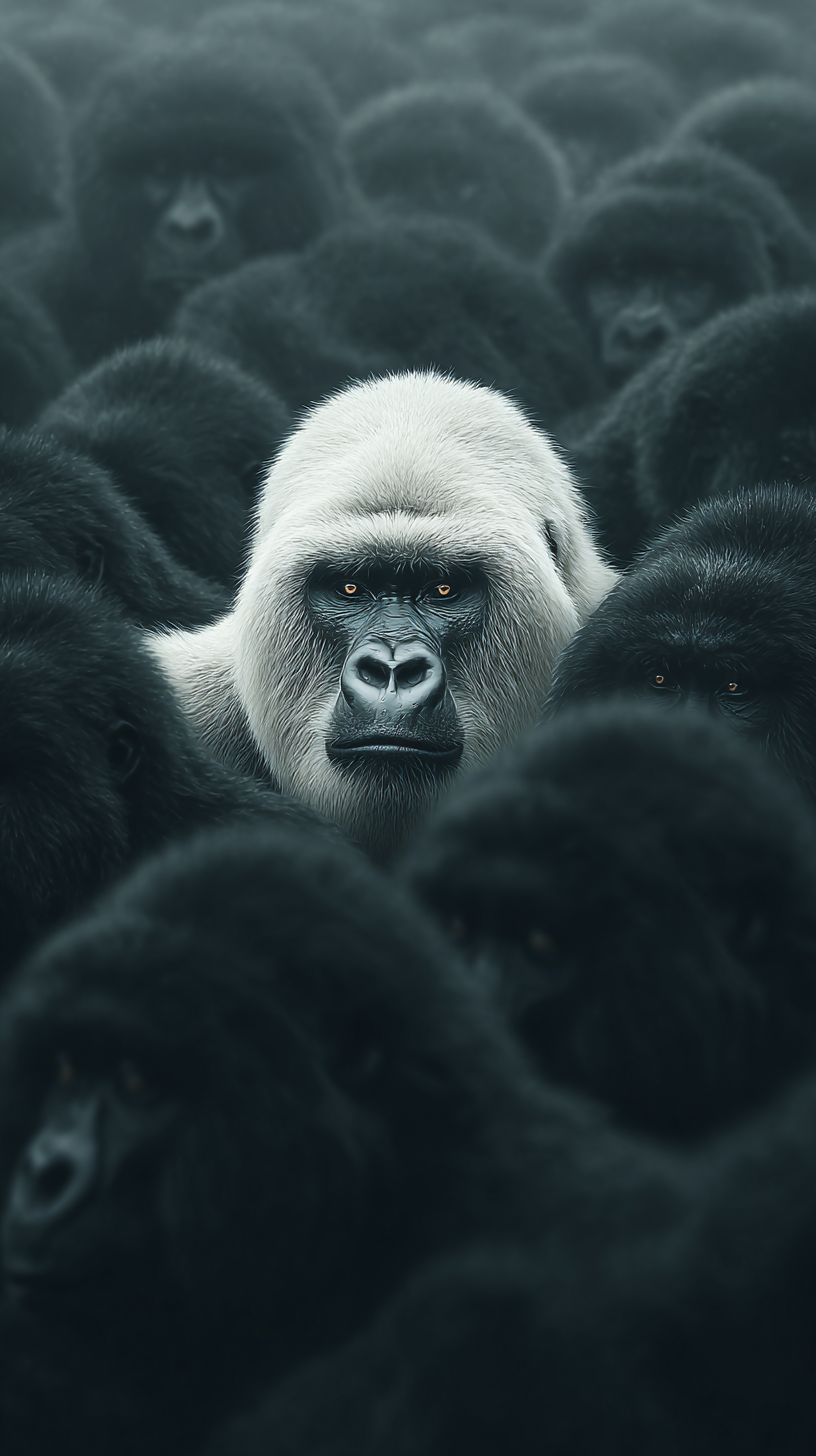a proud white gorilla standing alone among a sea of black gorillas, dramatic contrast, intense eyes, symbol of individuality and power --ar 9:16 --stylize 250