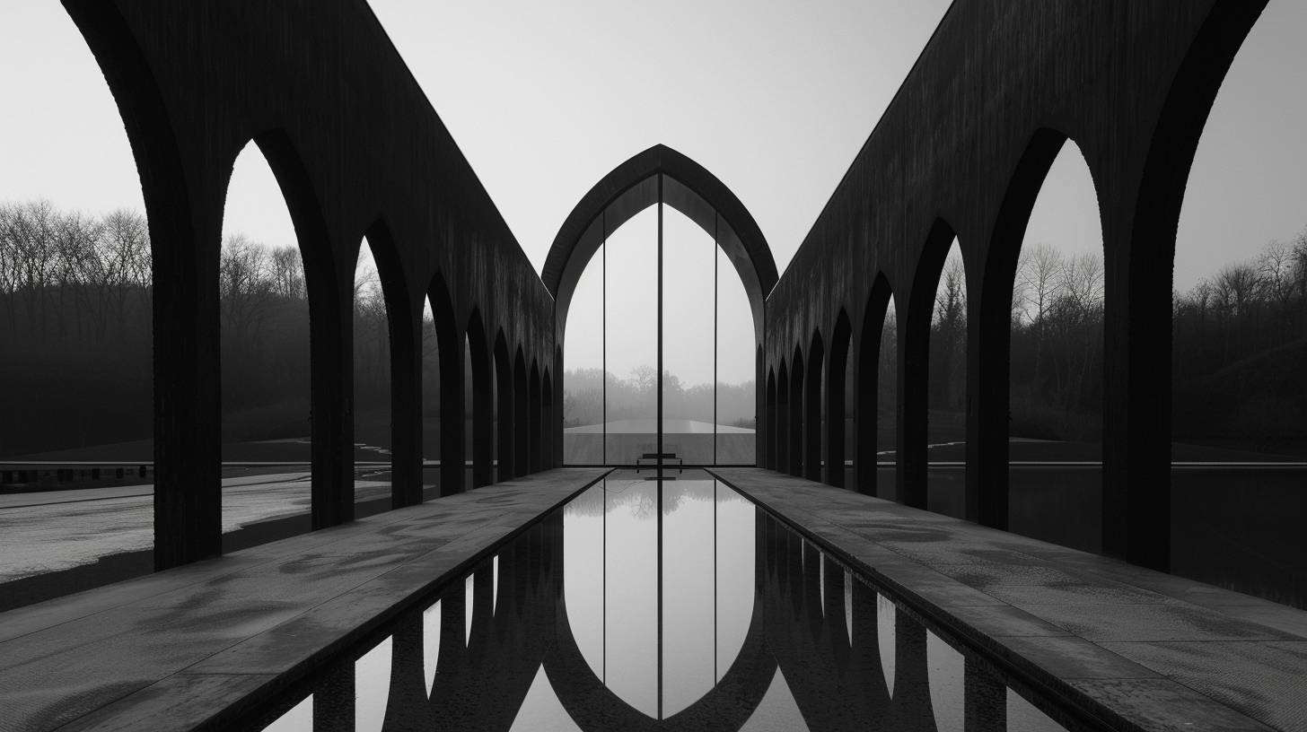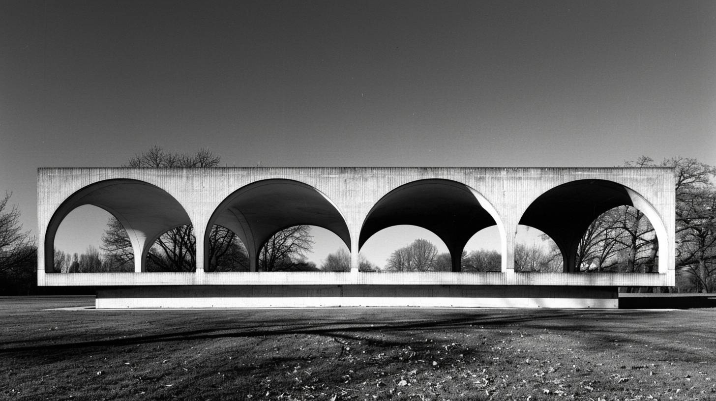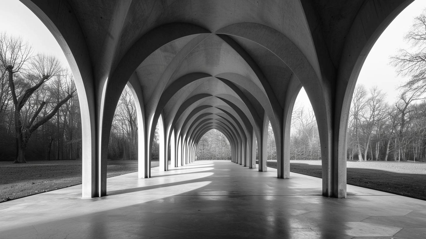 Estructura de arco gótico infinito diseñada por Mies van der Rohe, fotografía de Hélène Binet.