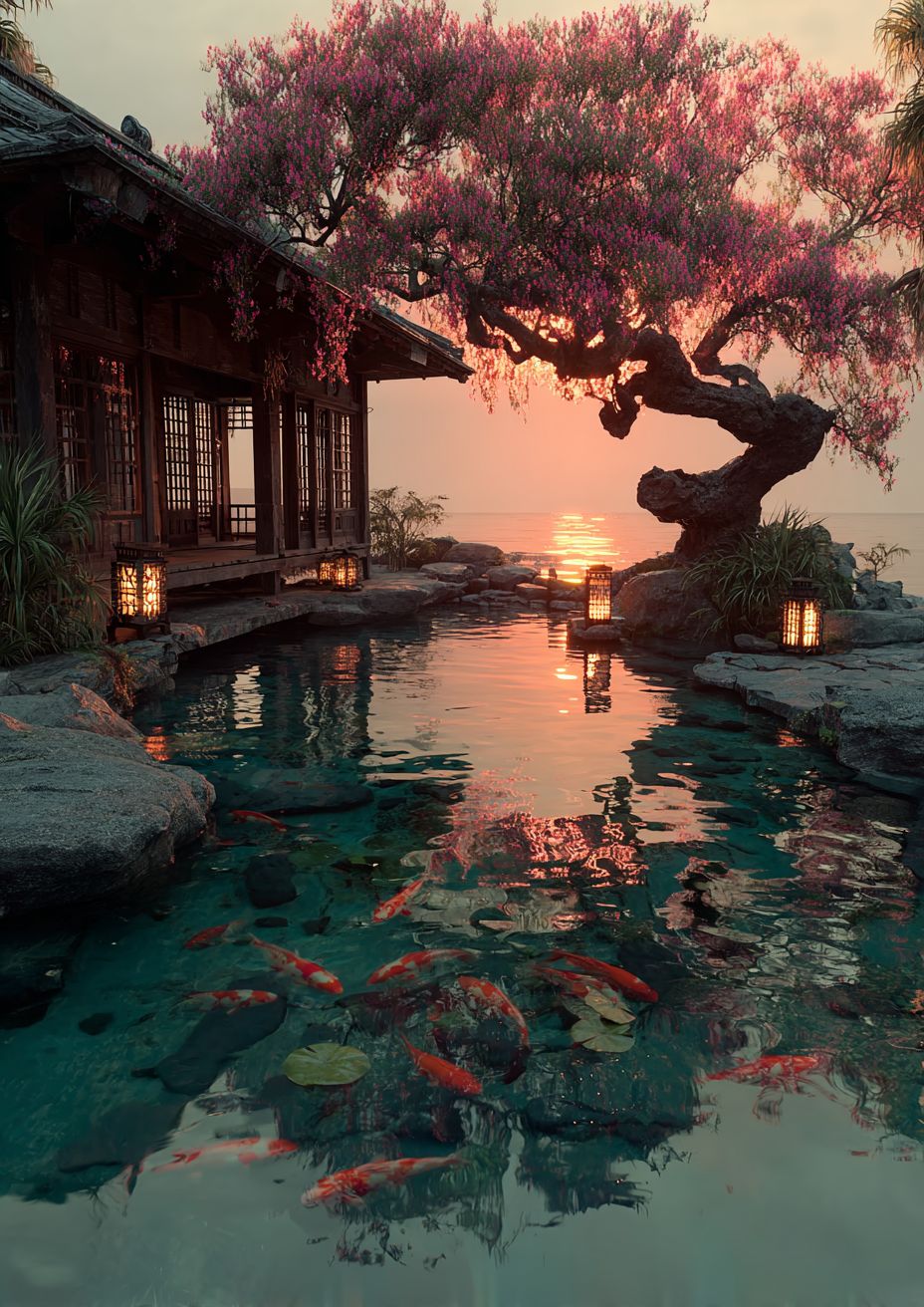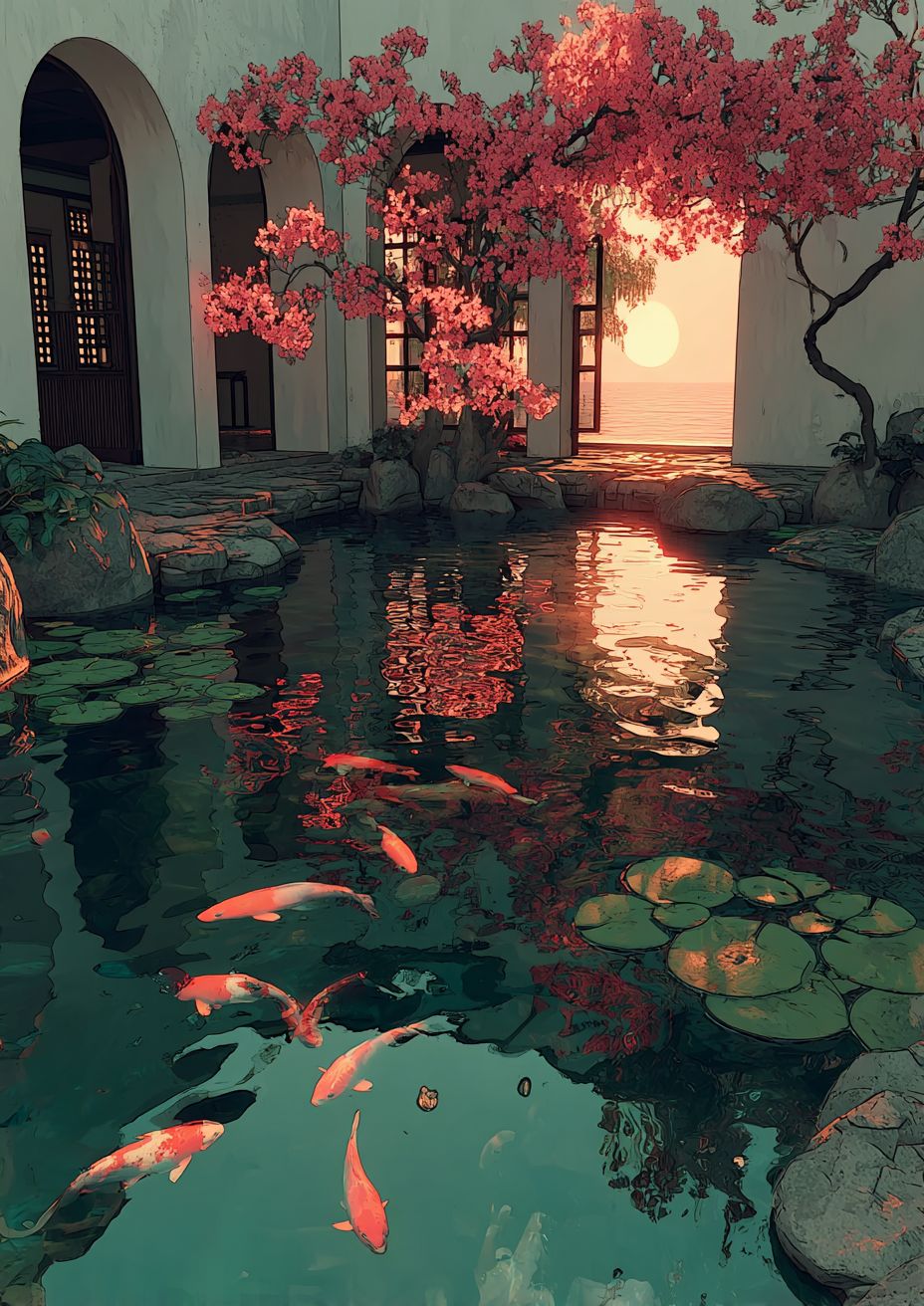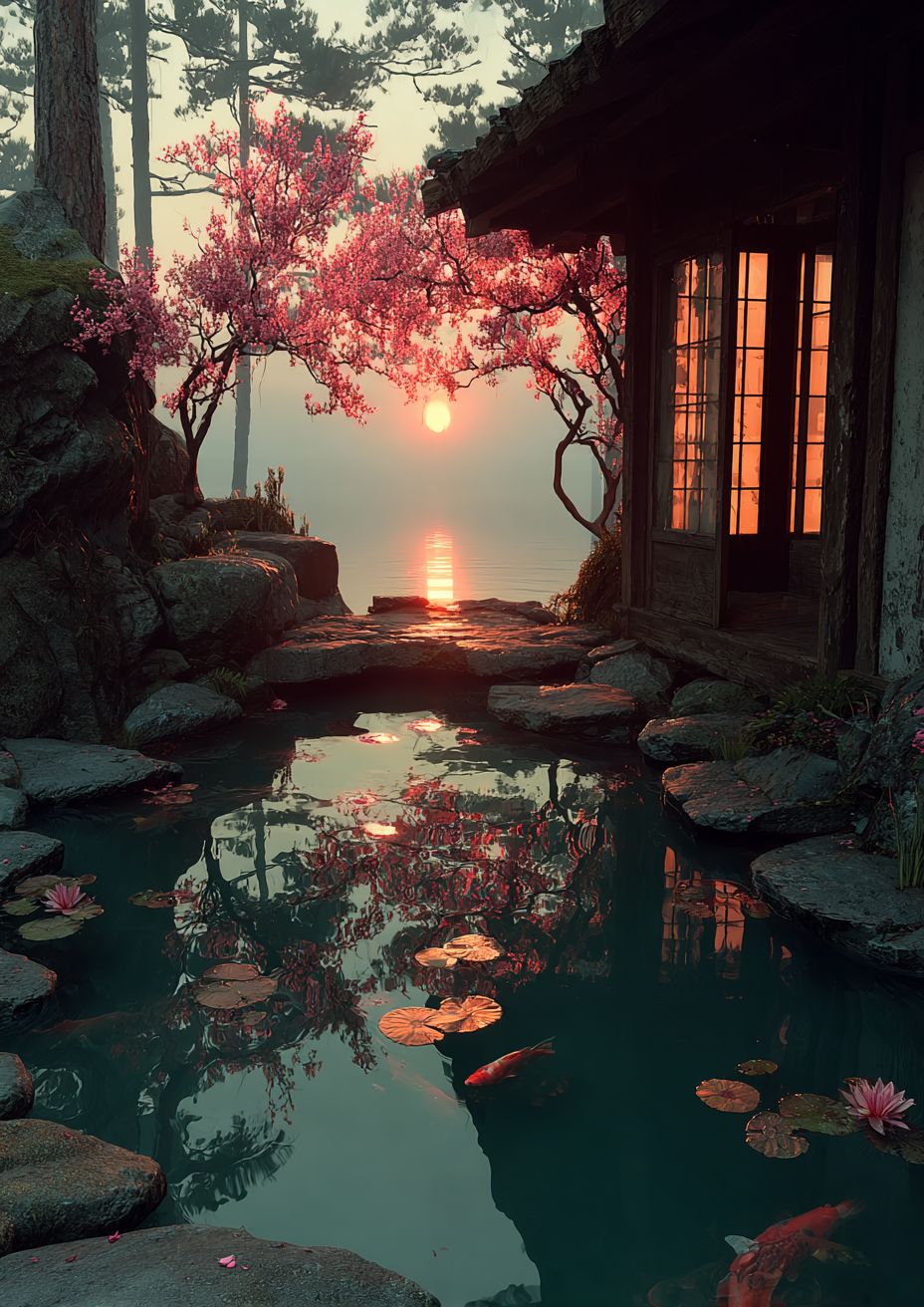 A serene Japanese garden at sunrise, koi pond with lotus flowers, cherry blossoms in bloom, minimalist aesthetic, hyper-detailed, tranquil atmosphere --ar 5:7 --v 7.0 --s 750