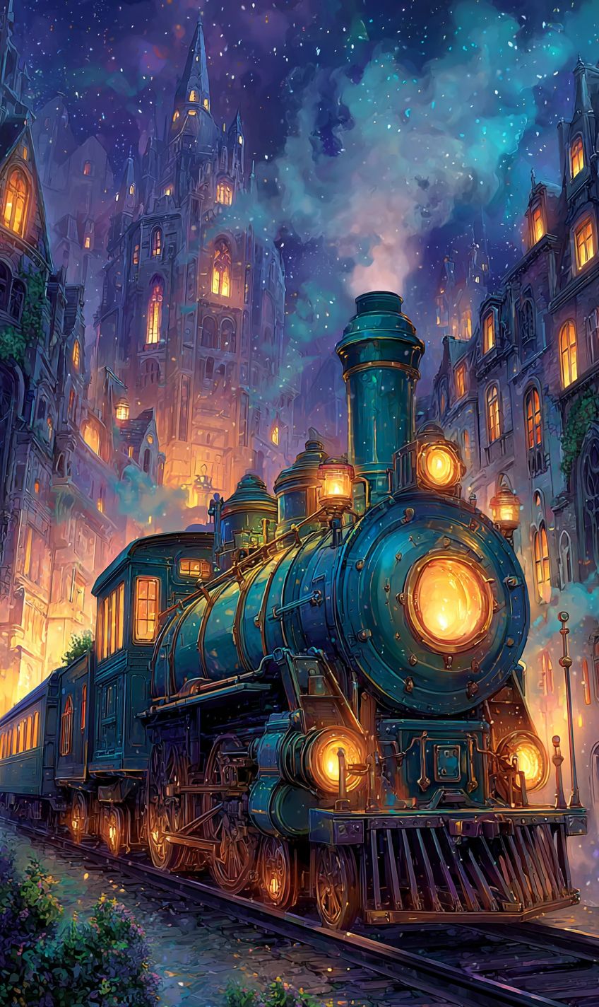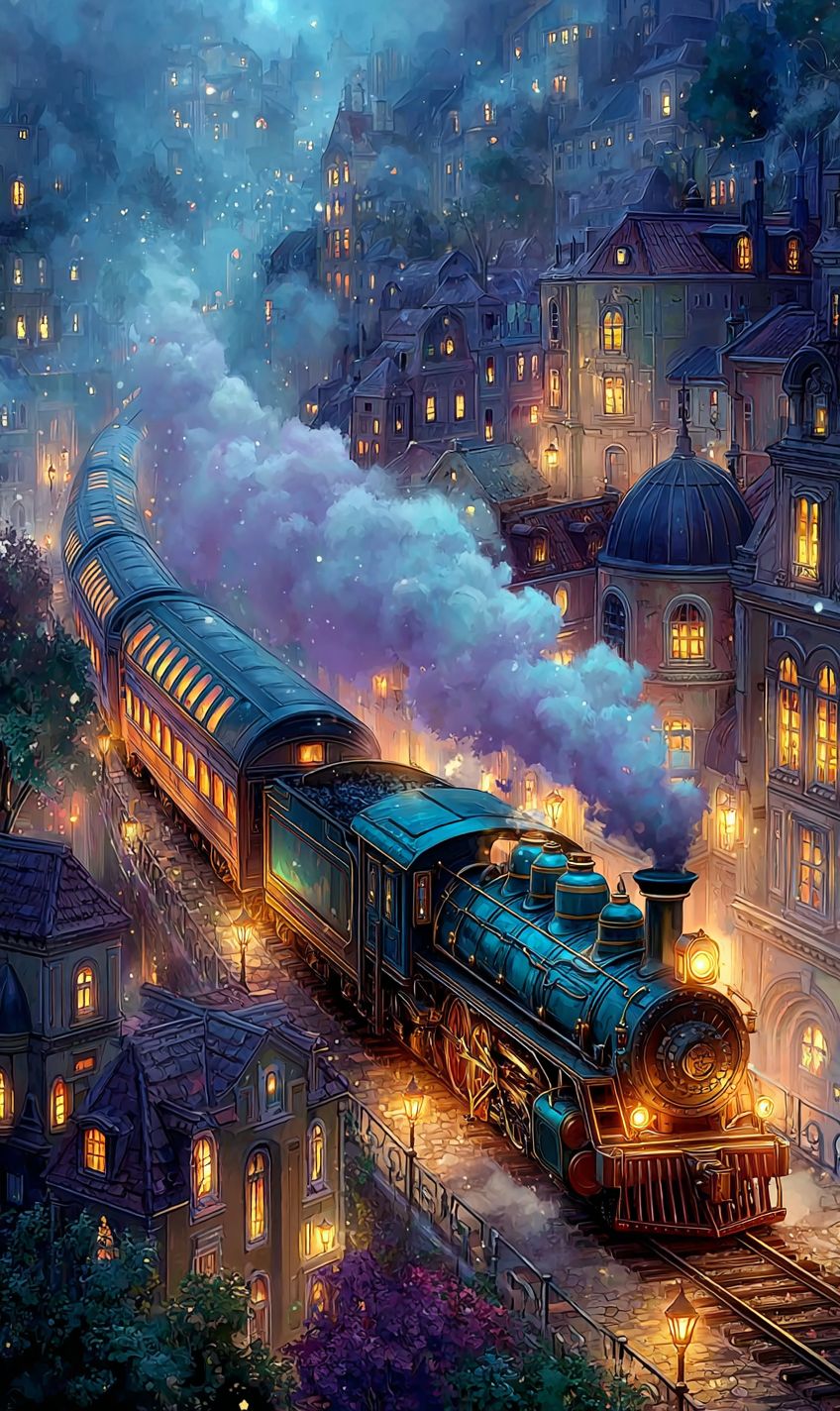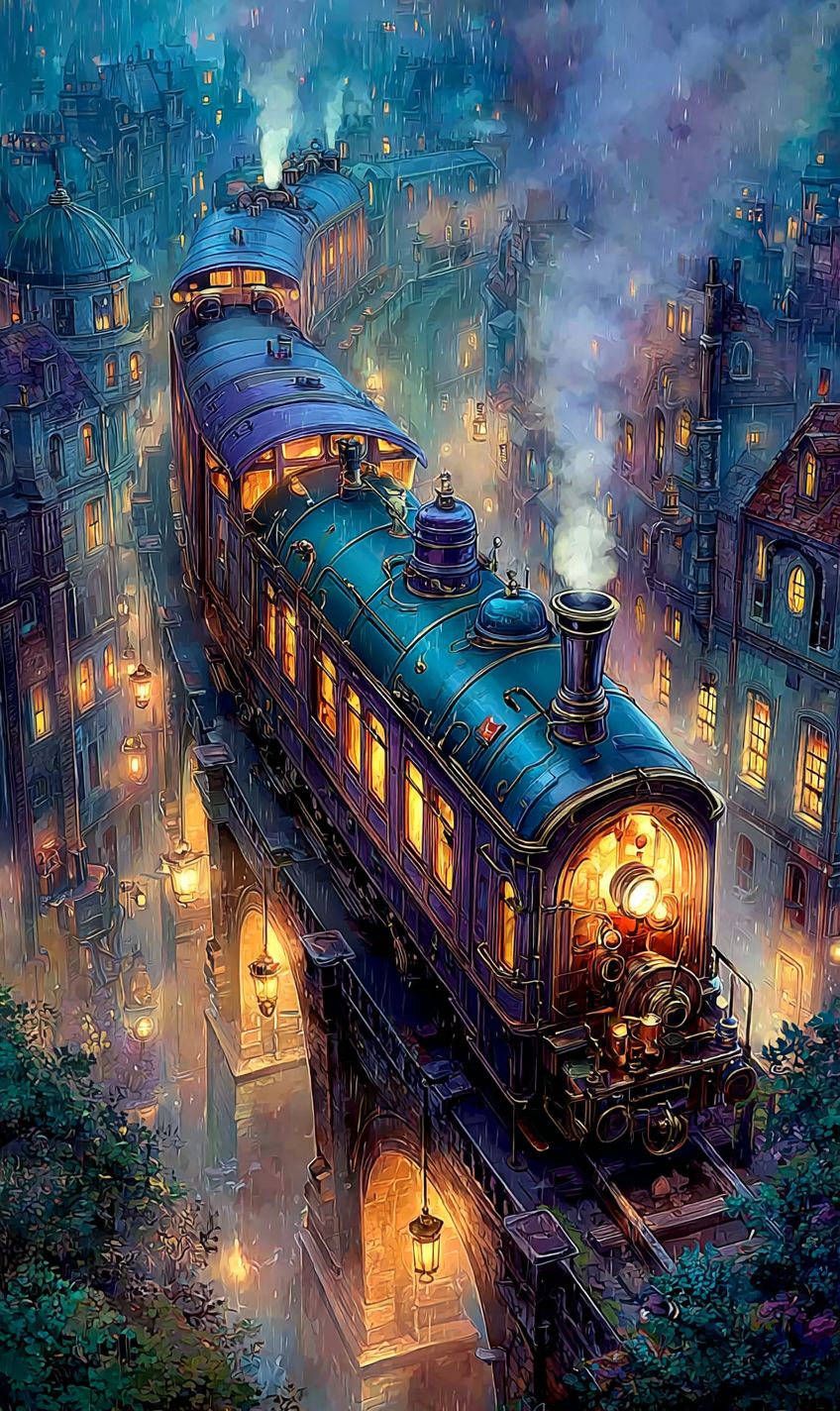 A steampunk train speeding through a foggy industrial city, brass and leather accents, glowing lanterns, cinematic composition, hyper-detailed, Victorian aesthetic --ar 3:5 --sref 1567159629 --v 7.0 --s 750