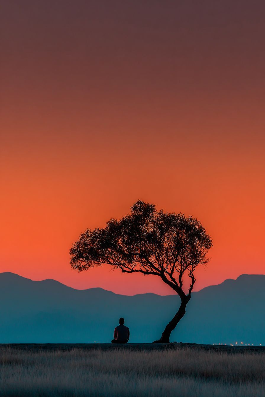 Una persona se sienta en silencio debajo de un árbol, contemplando el atardecer