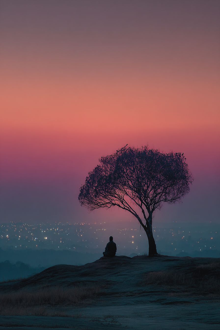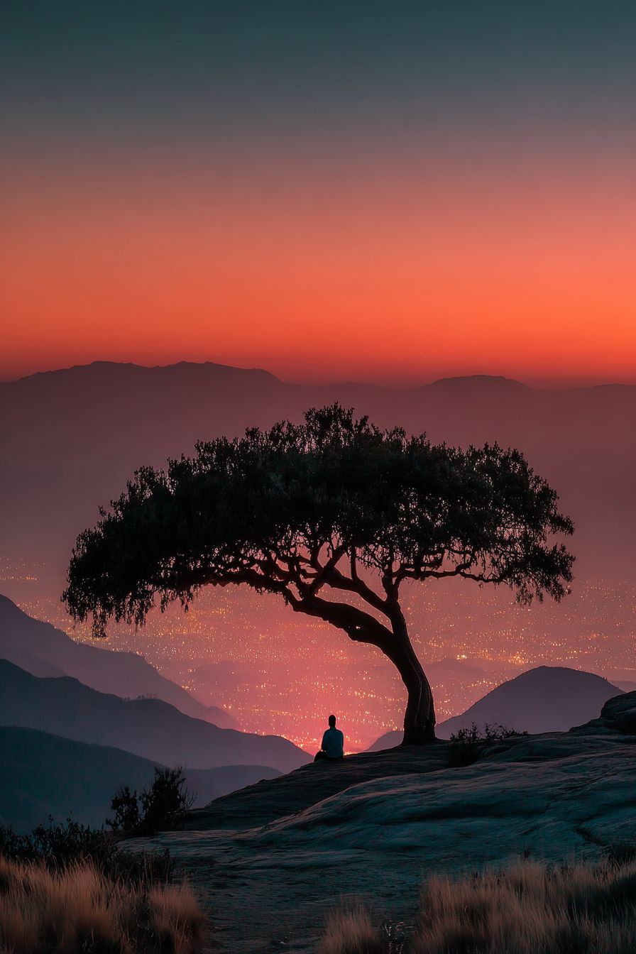 A medida que el sol se pone en el oeste, un árbol escaso se erige alto en el centro de la escena. Su tronco es recto y sus ramas se extienden hacia afuera, formando un contorno circular perfecto que se mezcla sin problemas con el enorme atardecer detrás de él. Debajo del árbol, una persona se sienta en silencio, mirando hacia el cielo, aparentemente perdida en sus pensamientos o disfrutando de la tranquilidad del momento. A lo lejos, el contorno de la ciudad se puede ver débilmente en el horizonte, con luces centelleantes comenzando a parpadear, anunciando la llegada de la noche.