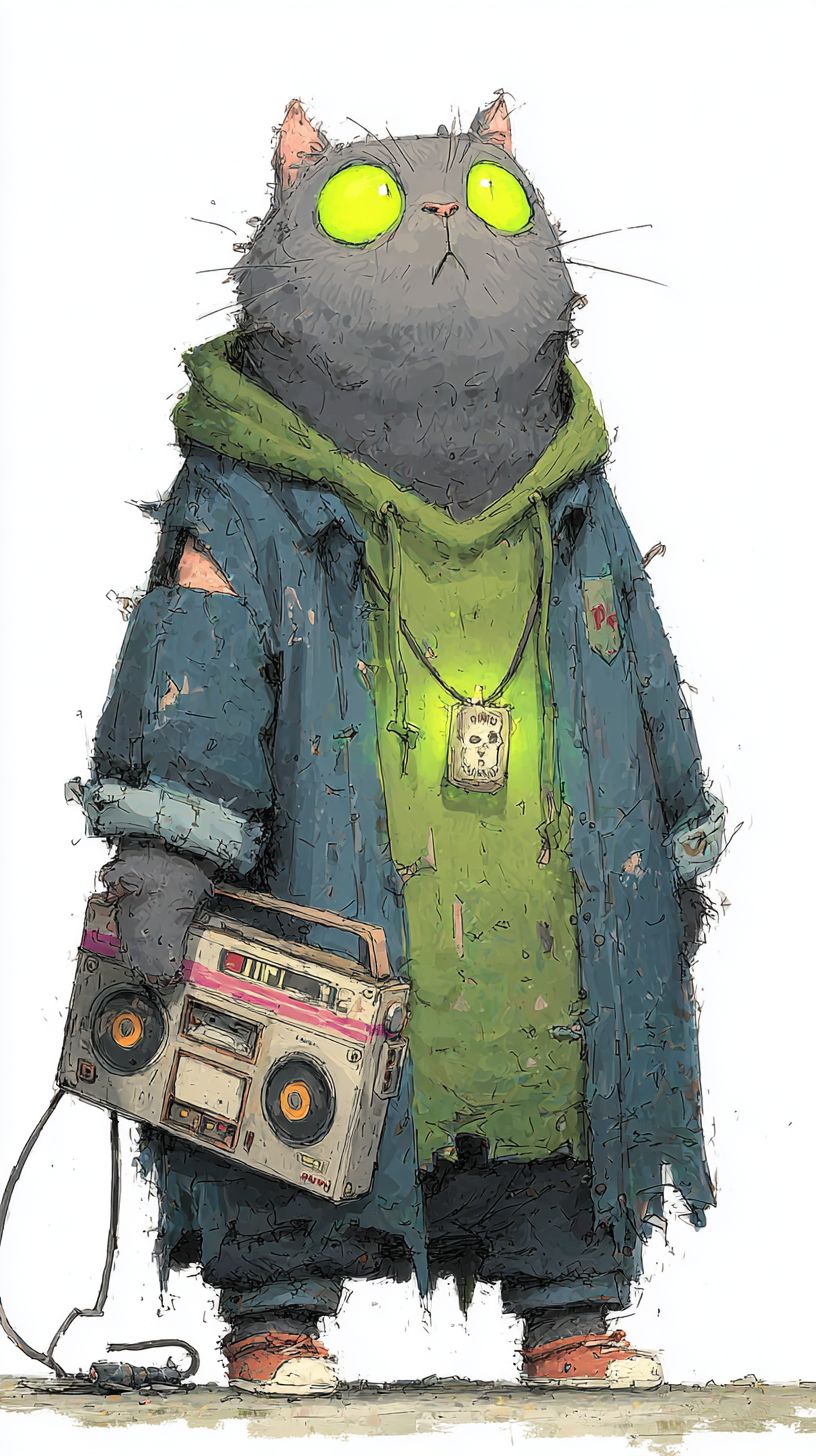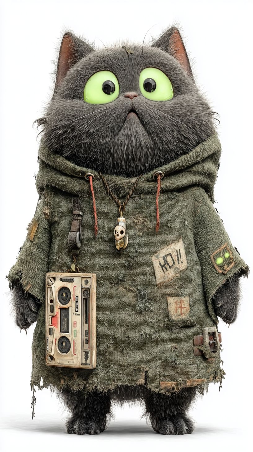 Paw Patrol, diseño de personajes, estilo de ilustración, alta resolución, hoja de diseño de personajes de cuerpo completo, un gato de dibujos animados British Shorthair muy lindo con suave pelaje gris, ojos redondos sobredimensionados (uno brillando en verde, el otro en plata), pequeños colmillos visibles, orejas ligeramente desordenadas, usando un pequeño hoodie y bufanda desgastados, un colgante mágico alrededor de su cuello, sosteniendo un reproductor de cassette en una pata, de pie y mirando hacia la derecha de la cámara, textura de figura de arcilla, estilo de juguete de vinilo, inspirado por Labubu, un poco extraño y caótico pero adorable, expresivo, enfoque nítido.