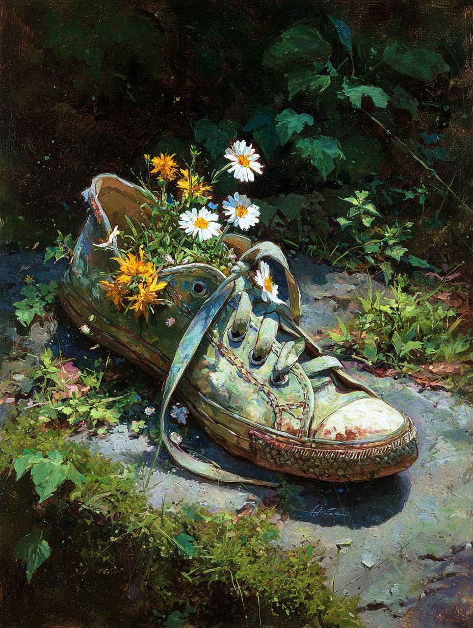 a simple acrylic painting of old tennis shoe with wildflowers growing out of them and light vegetation around them. Surrounded by a natural background. Highly texturized. --ar 3:4 --v 7.0