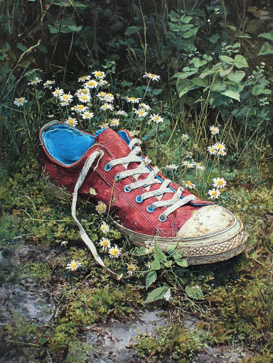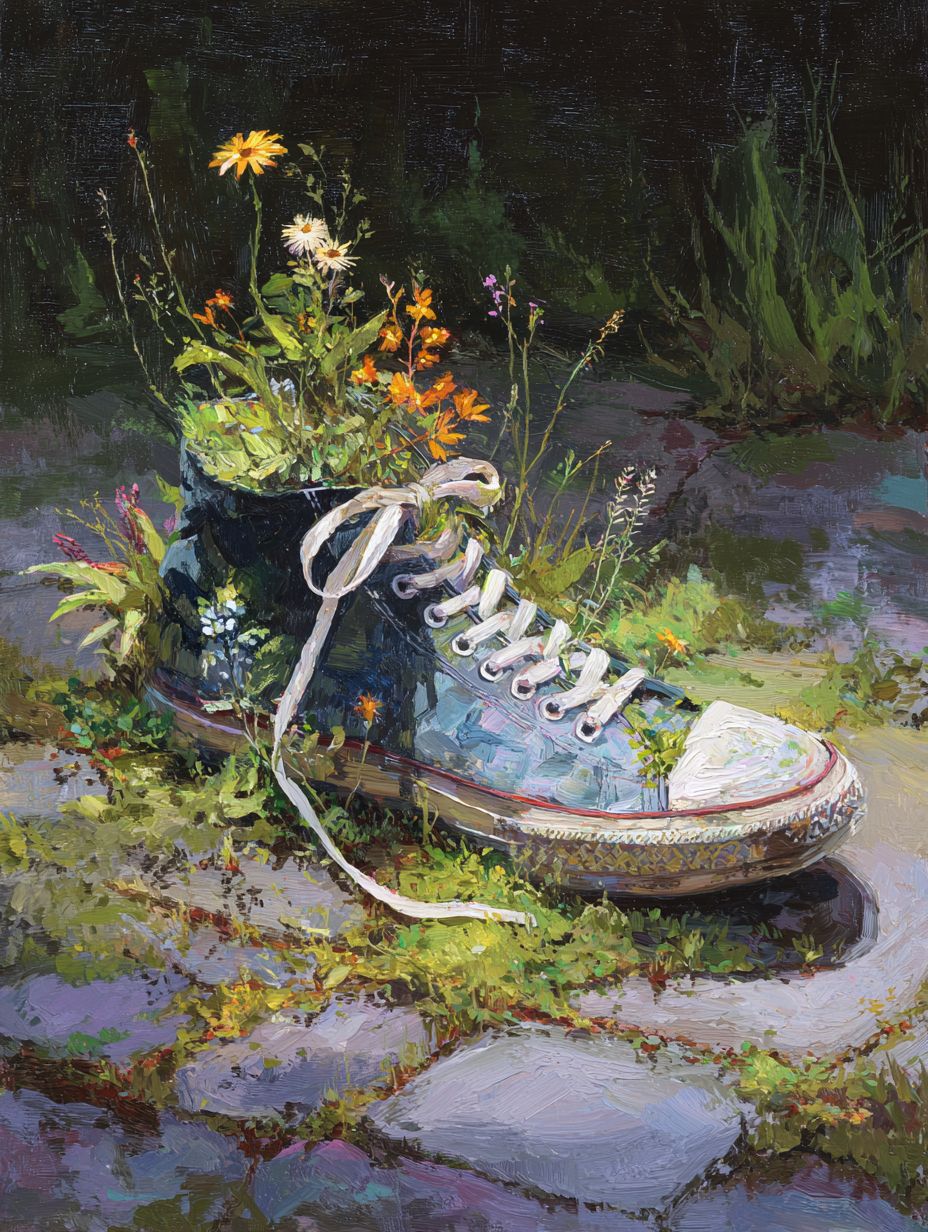 Una pintura acrílica simple de una zapatilla de tenis vieja con flores silvestres que crecen de ella y vegetación ligera a su alrededor. Rodeada de un fondo natural. Muy texturizada.