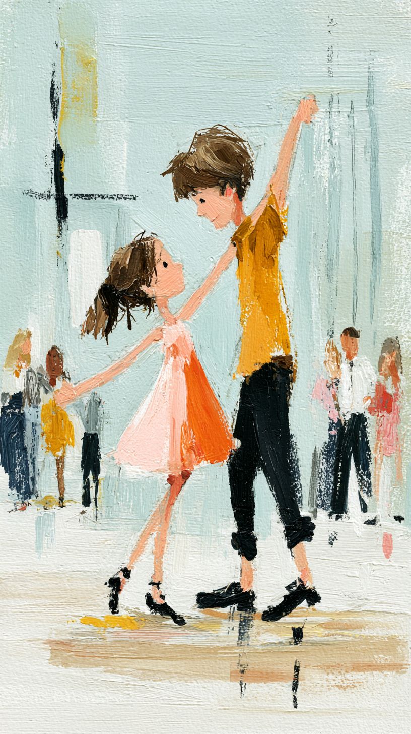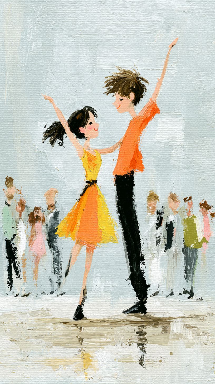 Una ilustración infantil simple y minimalista de un niño y una niña bailando un baile de salón de manera sincronizada en poses elegantes. La niña lleva un vestido naranja, y el niño lleva una camisa naranja y pantalones negros, bailando en un piso de madera, rodeados por un público suavemente difuminado en el fondo para mantener el foco en los bailarines. La textura es vívida con acuarelas y lápices de colores, creando una atmósfera ligera y elegante, en estilo de dibujos animados.
