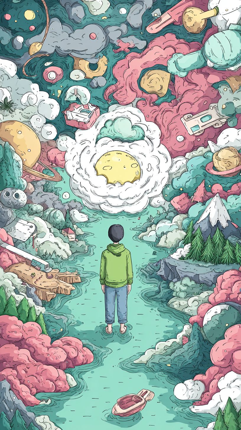 An illustration that flips the consciousness of this world, showing that consciousness exists outside of oneself. Drawn in a way that is easy to understand, cute, and stylish. --ar 9:16