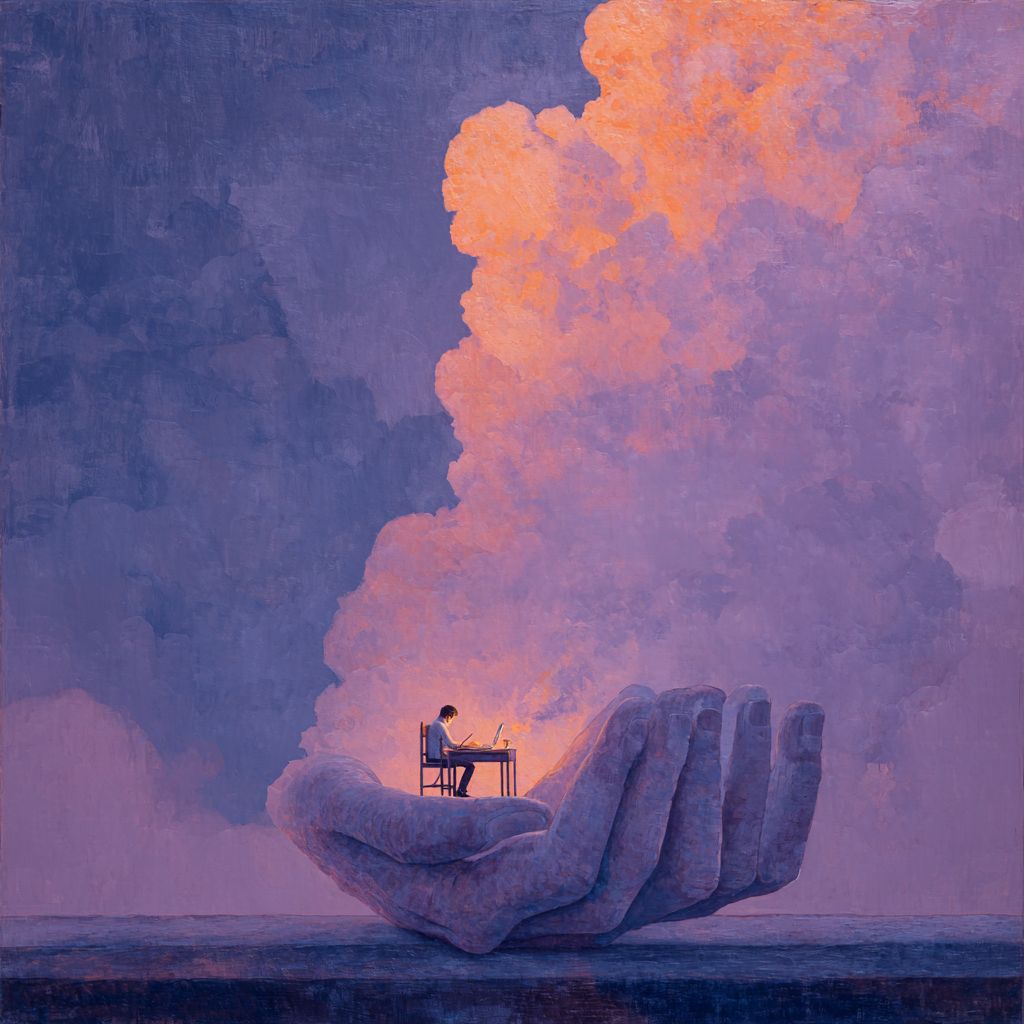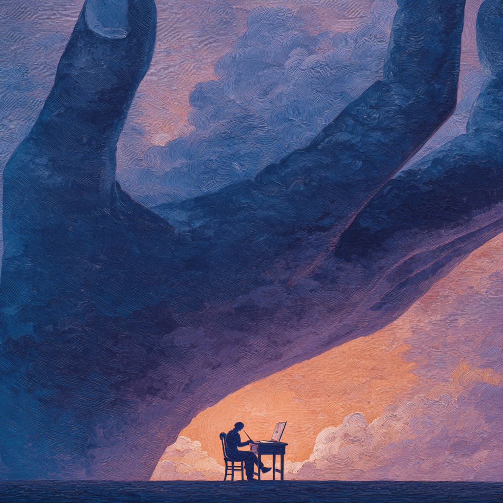 Una pintura surrealista al estilo de René Magritte, que representa una gigantesca mano humana en el fondo de la composición, con la palma hacia arriba, sosteniendo un escritorio en el que está sentada y escribiendo una joven artista. El fondo es de un violeta oscuro y profundo con suaves gradientes de naranja y lila, creando una atmósfera onírica y poética. Pinceladas suaves, textura de pintura al óleo, alto detalle, sombras suaves y formas surrealistas suaves.