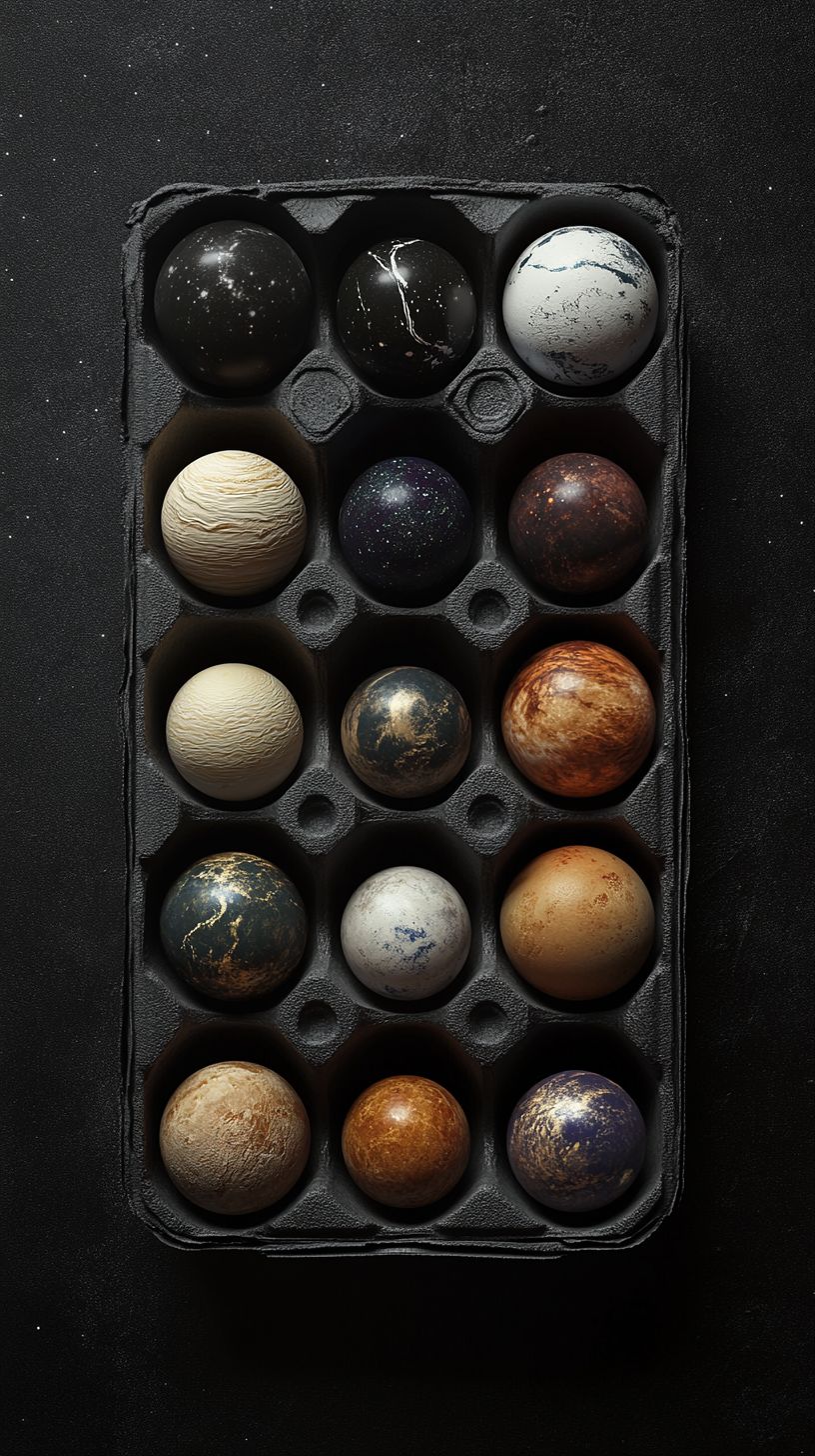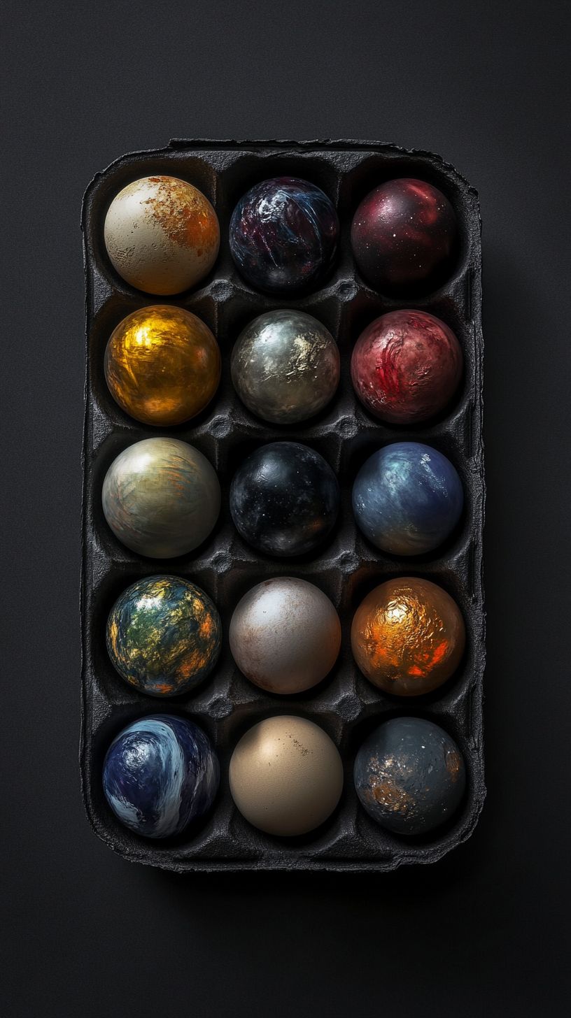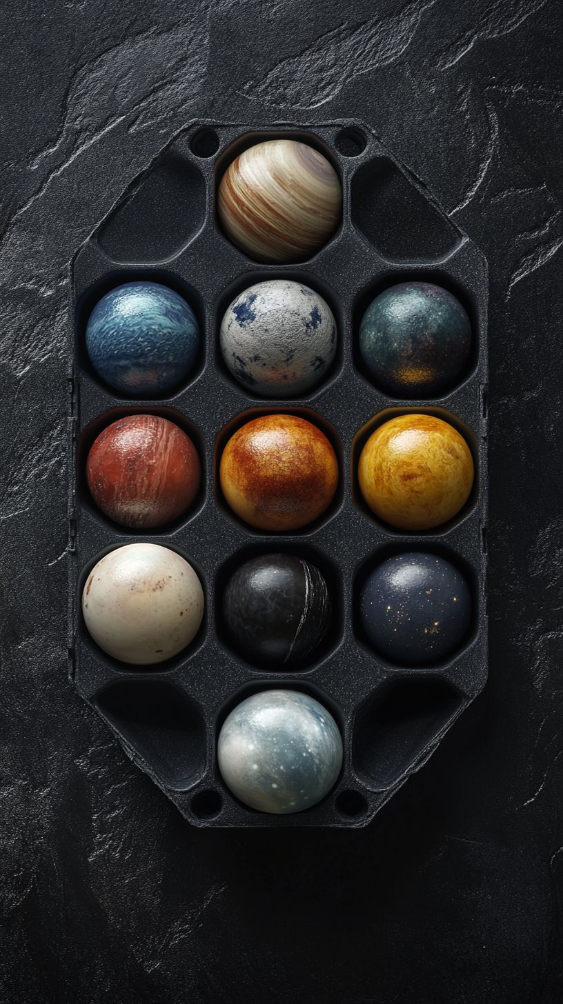 Top-down view of a matte black egg carton with celestial body: Mercury, Venus, Earth, Mars, Jupiter, Saturn, Uranus, Neptune, Sun, Moon. Artistic textures, vibrant colors, stylized clouds and rings, subtle glowing effects, sculptural shadows, cinematic lighting, ultra-detailed, slightly surreal photorealism, exhibition-style composition, sharp focus, 8K, --ar 9:16 --v 6.1