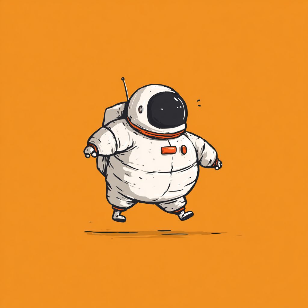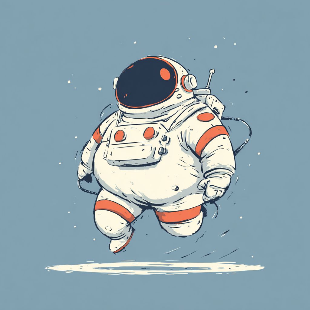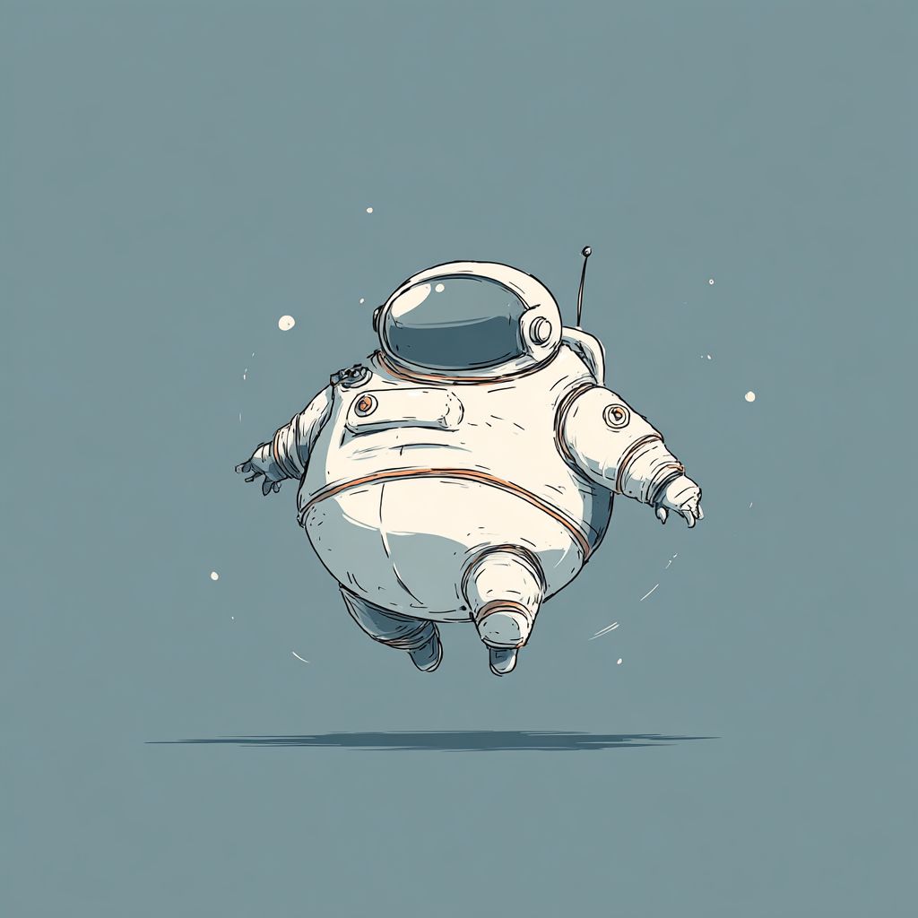 Un astronauta flotando en el espacio, vistiendo un voluminoso traje espacial blanco que está inflado y hinchado como un globo, redondo y cómicamente sobredimensionado. El casco está estirado y abultado, dando un aspecto inflado y de dibujo animado. Caricatura vectorial caprichosa, proporciones exageradas, contornos audaces, fondo de color sólido.