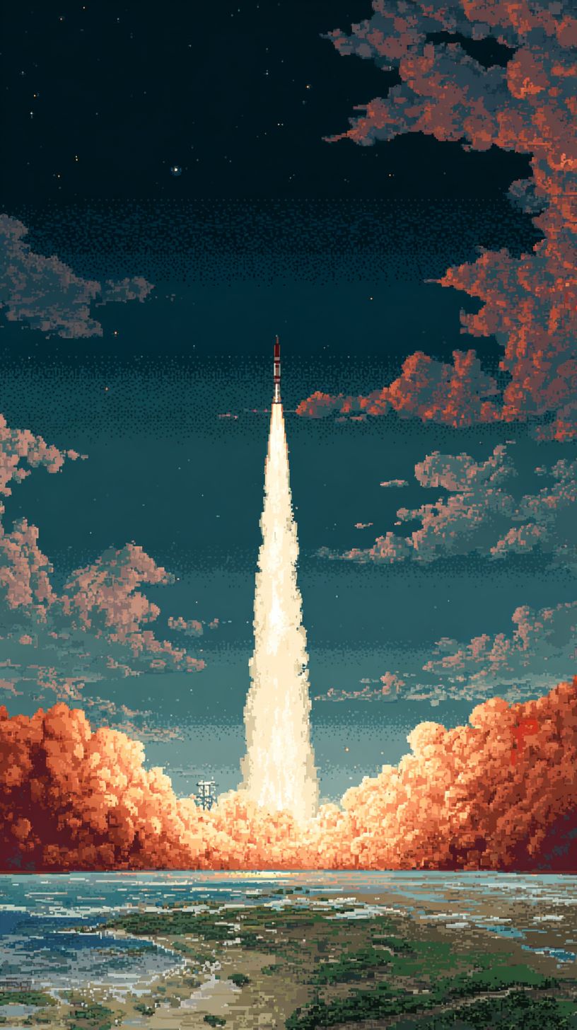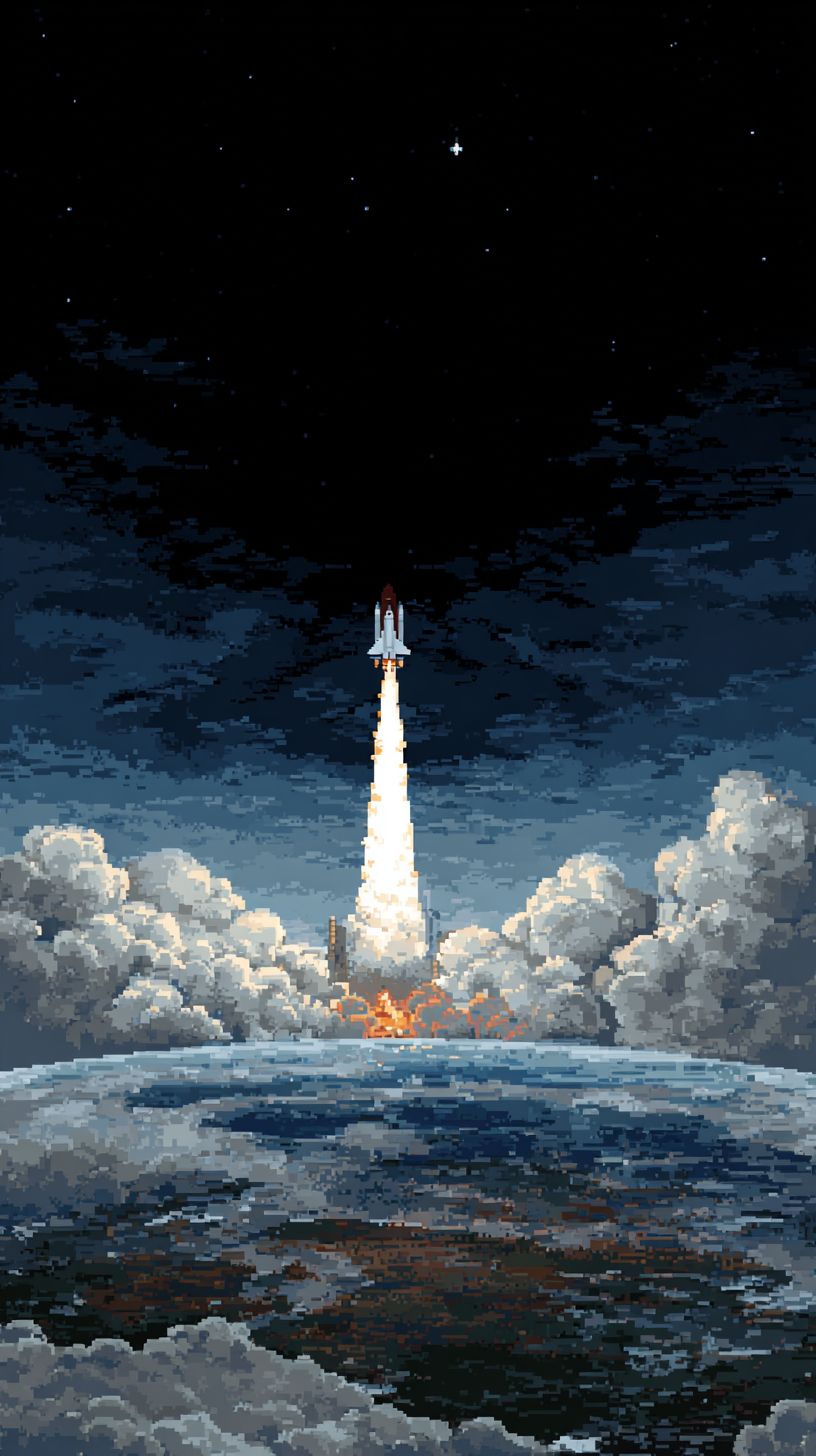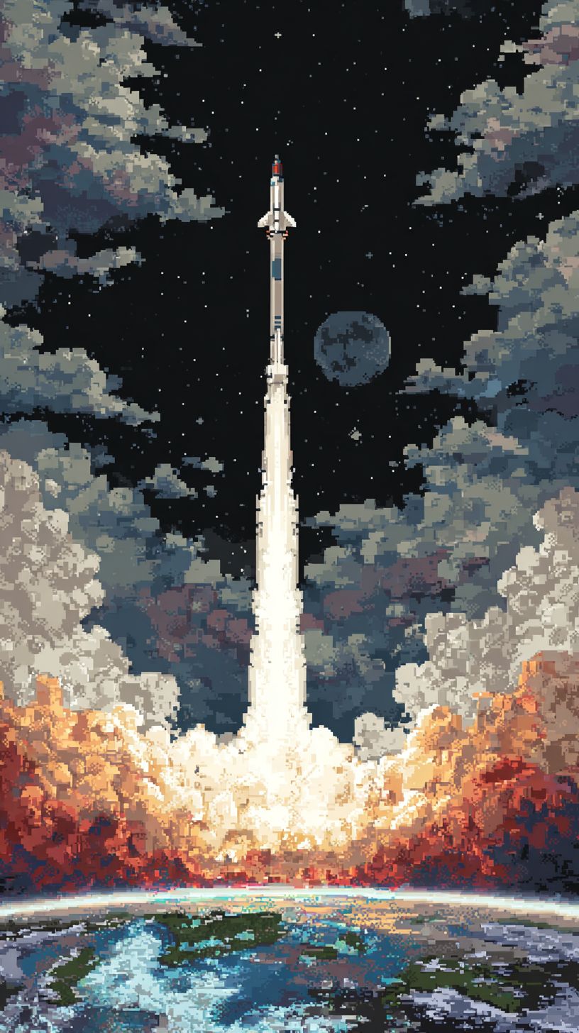 Una escena vertical de un cohete lanzándose desde la Tierra hacia el espacio, perspectiva cinematográfica, la parte inferior de la imagen en estilo fotorrealista mostrando la superficie de la Tierra, la atmósfera, humo y llamas, transicionando gradualmente al estilo de arte pixelado de 8 bits en la parte superior con cohete pixelado, fuego pixelado, estrellas pixeladas, transición suave del realismo al arte pixelado, alto contraste.