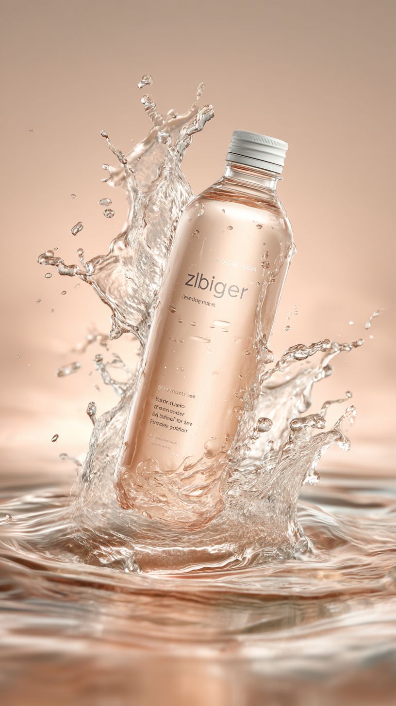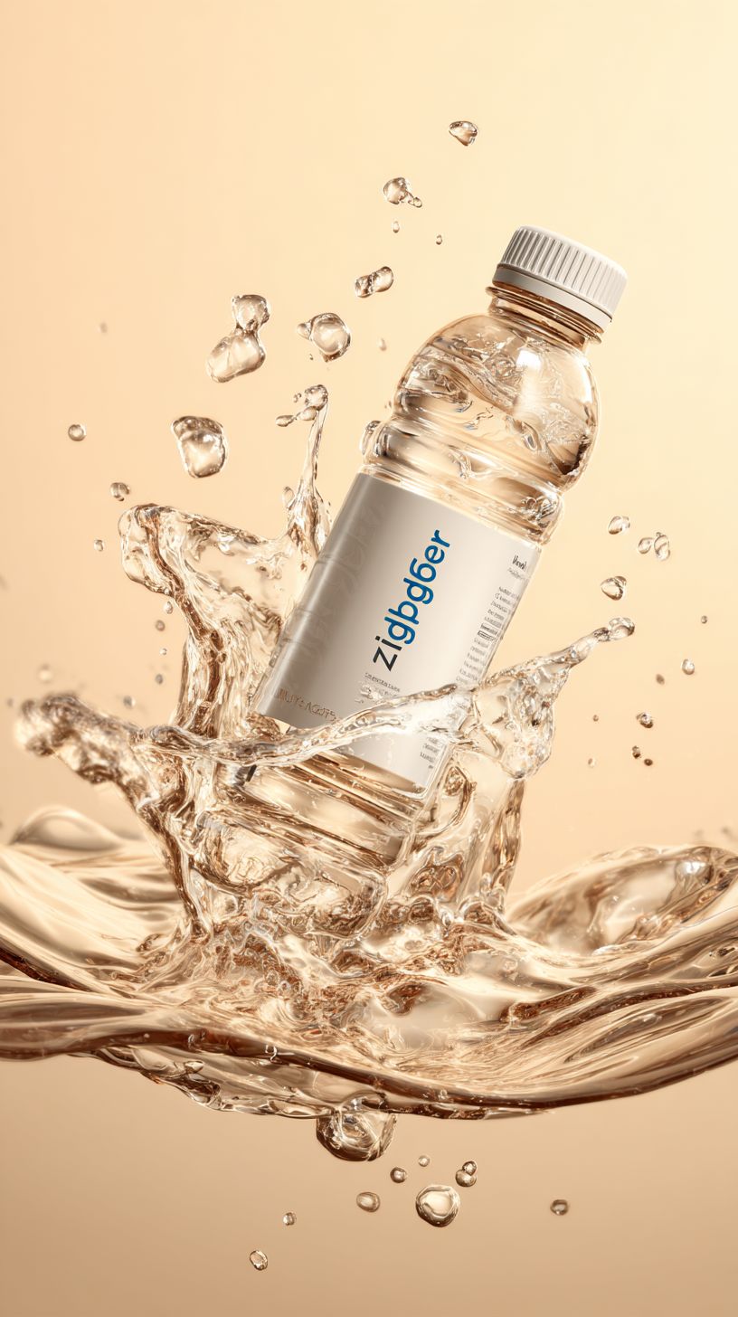 A half-filled plastic water bottle, labeled "zlbigger," splashing dramatically into clear water. The bottle is partially submerged, creating realistic water bubbles, ripples, and splashes. The water in water bottle is also in dramatic motion. The background is a soft beige with no distractions, focusing only on the product and the water movement. Photorealistic, high-resolution, professional product photography style, sharp lighting, natural reflections, minimal shadows. --ar 9:16 --raw --v 7.0