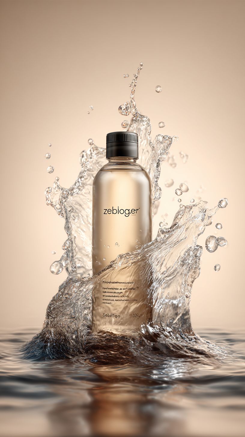 Una botella de plástico medio llena, etiquetada como 'zlbigger', salpicando dramáticamente en agua clara. La botella está parcialmente sumergida, creando burbujas de agua, ondas y salpicaduras realistas. El agua en la botella también está en movimiento dramático. El fondo es de un suave color beige sin distracciones, enfocándose solo en el producto y el movimiento del agua. Estilo de fotografía de productos fotorealista, de alta resolución, profesional, con iluminación nítida, reflejos naturales y sombras mínimas.