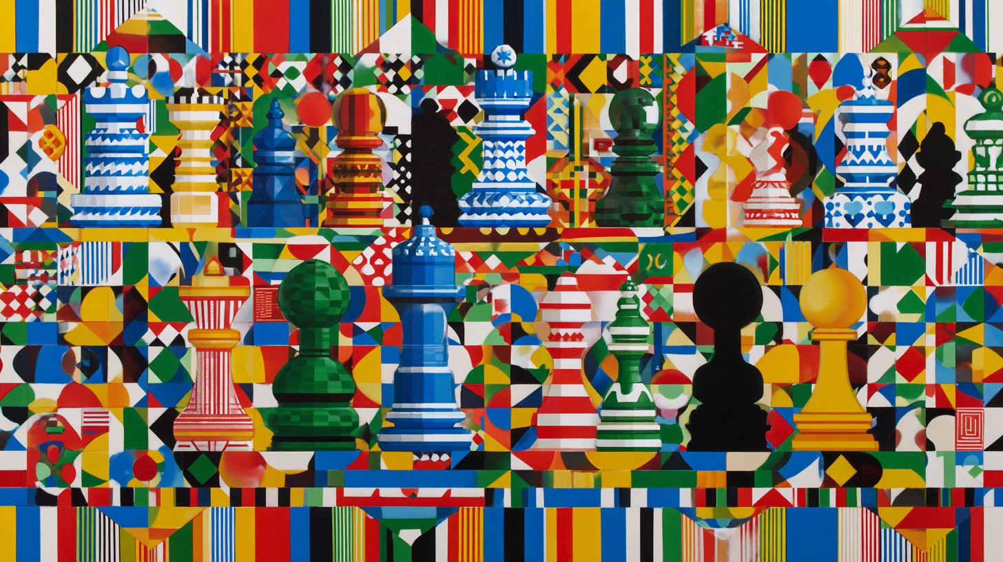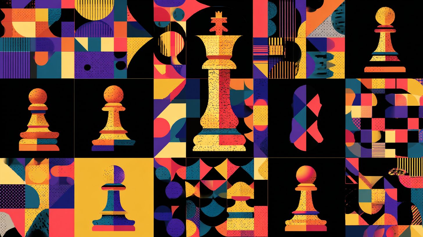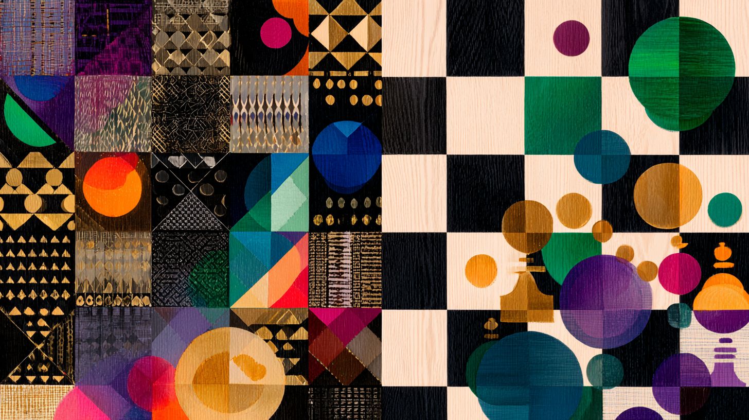 Patrones geométricos coloridos que incorporan elementos de ajedrez