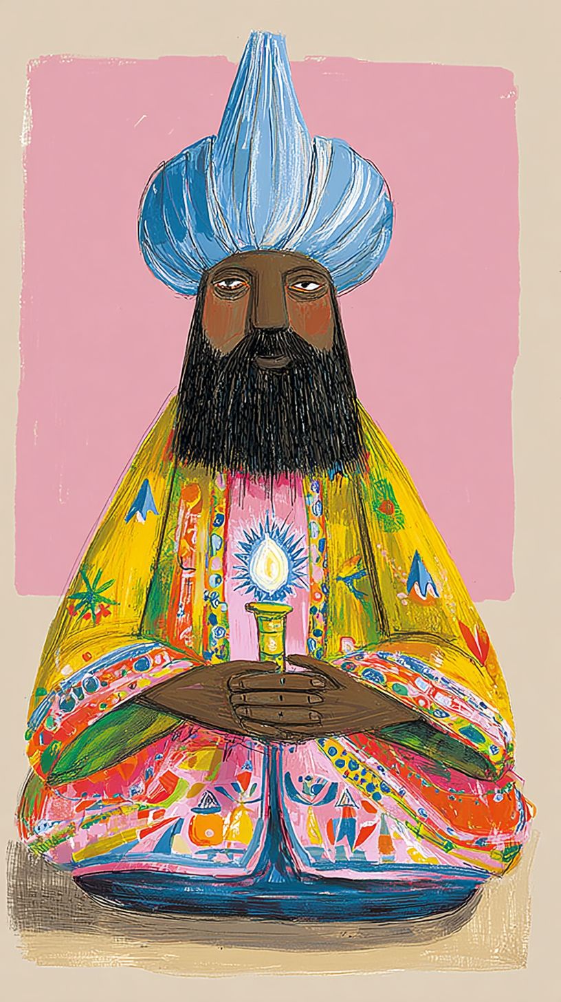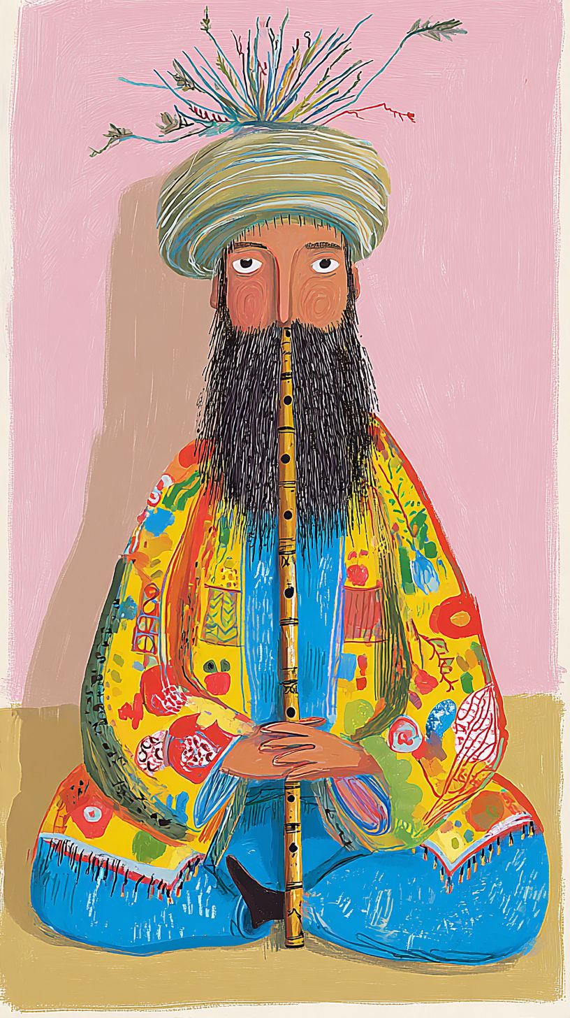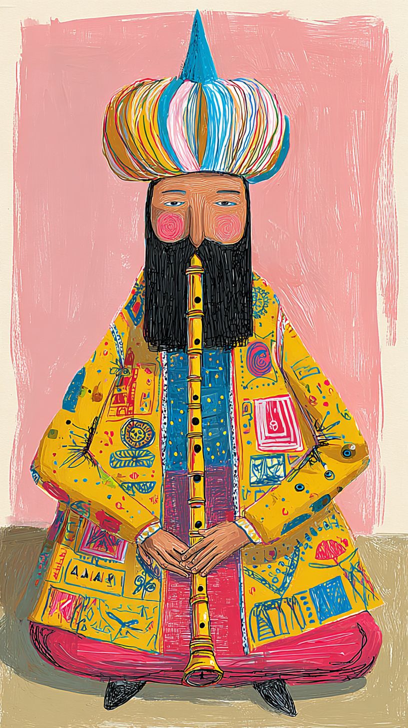 A mystical Sufi master, sitting cross-legged, facing the camera directly in a perfectly symmetrical composition. He wears a large turban and a long, flowing qamis richly adorned with colorful patterns, reminiscent of traditional Sufi garments. His eyes are open, looking calmly and directly at the viewer with a serene, hypnotic expression. Both of his hands are clearly visible, holding a long flute centered in front of him. The flute is prominent and slightly glowing, as if it radiates spiritual energy. His robes are detailed with textures and vibrant colors, suggesting sacred symbolism. Background is plain and neutral to facilitate cut-out. Full body visible, symmetrical, ritual-like pose --ar 9:16 --sref 8143 --v 7.0