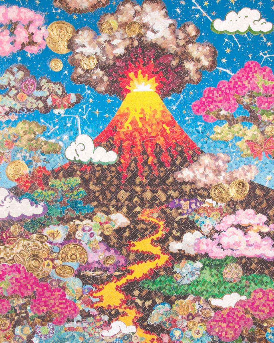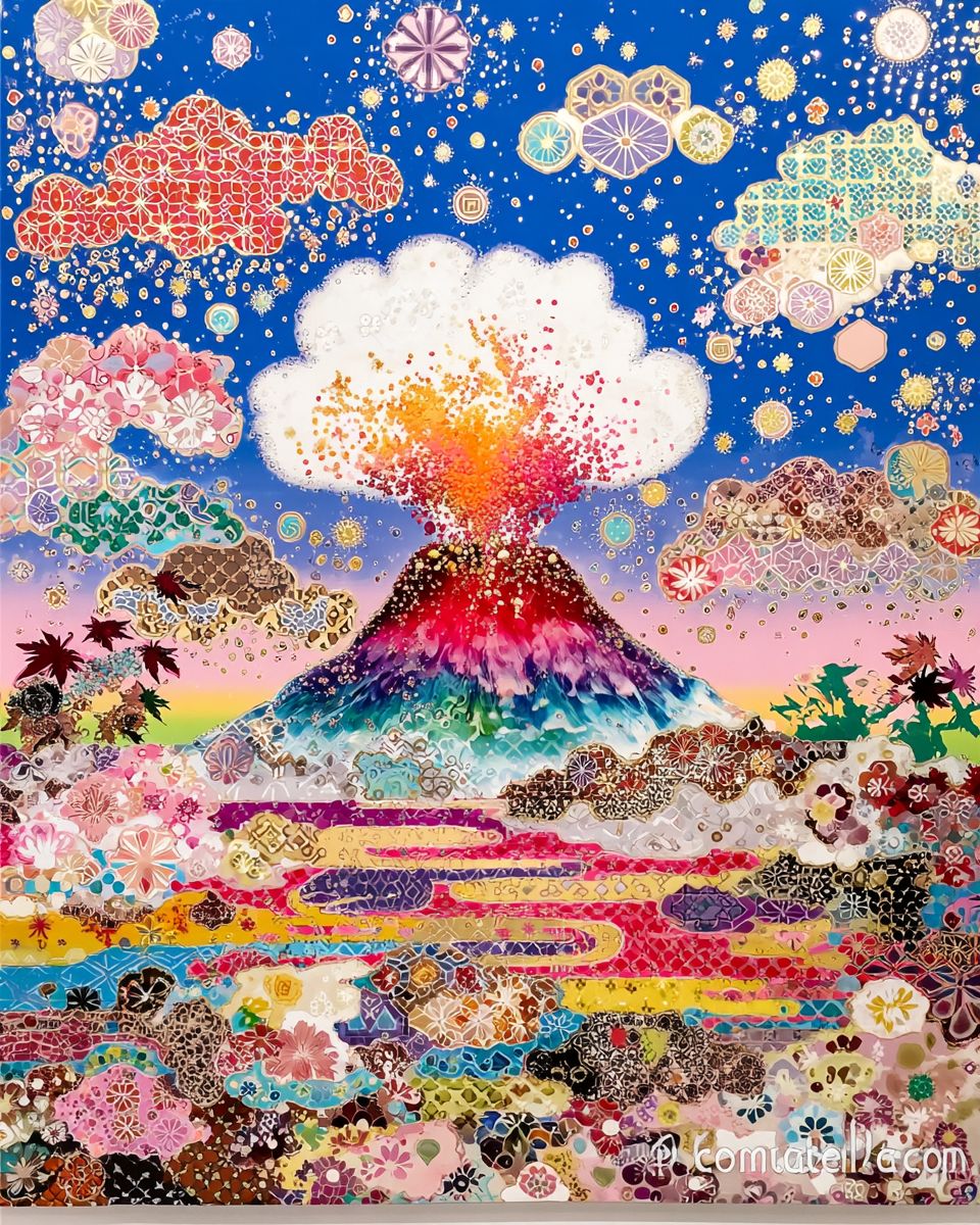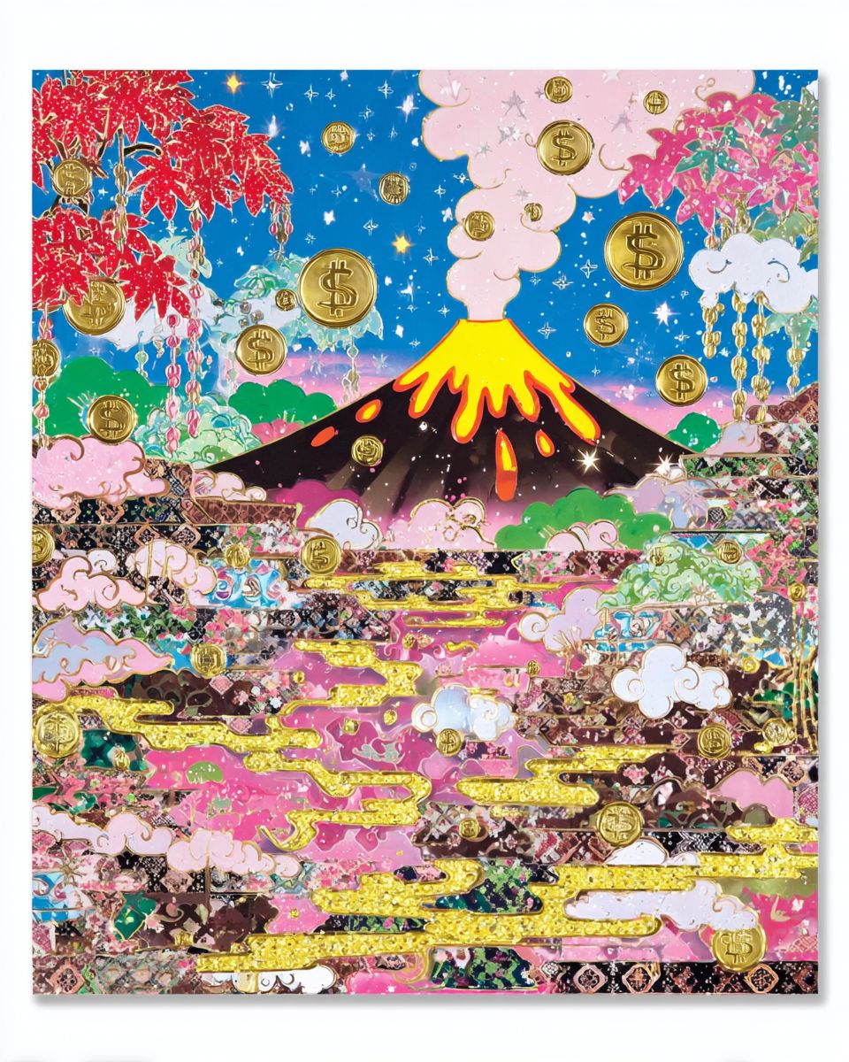 Esta pintura decorativa simbólica combina elementos del Fuego y la Tierra, presentando un volcán en erupción con vetas minerales doradas