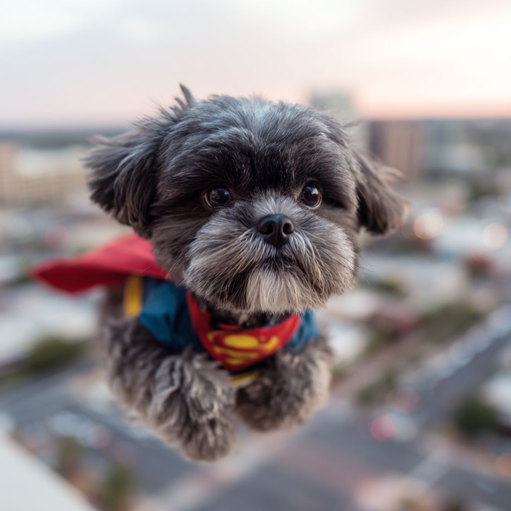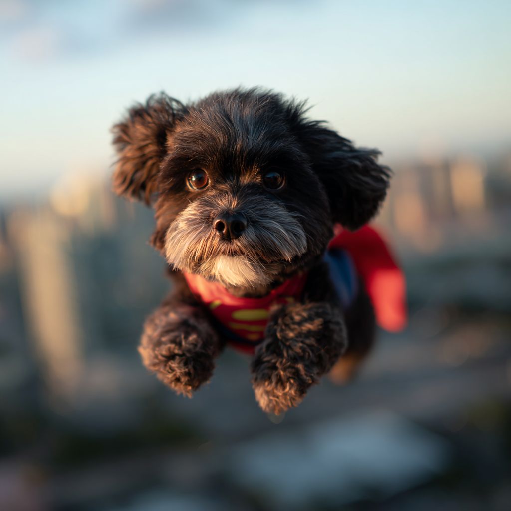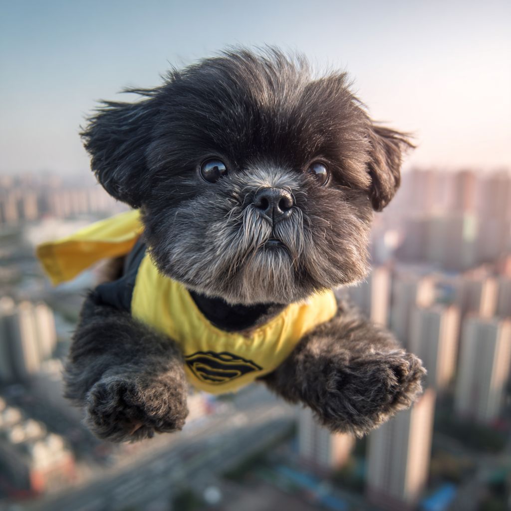 Un pequeño Shih Tzu negro con una capa de superhéroe volando sobre una ciudad