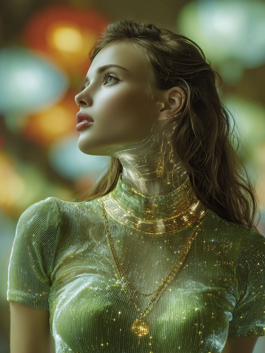 Una foto frontal de una hermosa mujer ciborg blanca (con piezas electrónicas doradas muy sutiles en su piel) que lleva una camiseta corta verde furiosa, de pie en medio de una bulliciosa calle asiática, fotografía de moda de alta calle, luz cálida