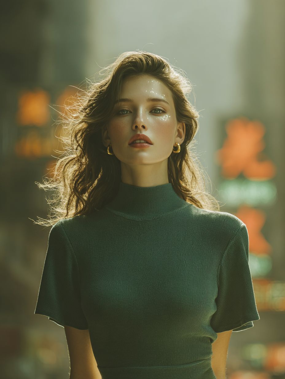 front shot of a beautiful cyborg white woman (with very subtle golden electronic pieces in her skin) wearing a furious green cropped t-shirt, she is standing in the middle of a busy asian street, high street fashion photography, warm light --chaos 11 --ar 3:4 --v 7.0 --stylize 1000 --profile orztmew --raw