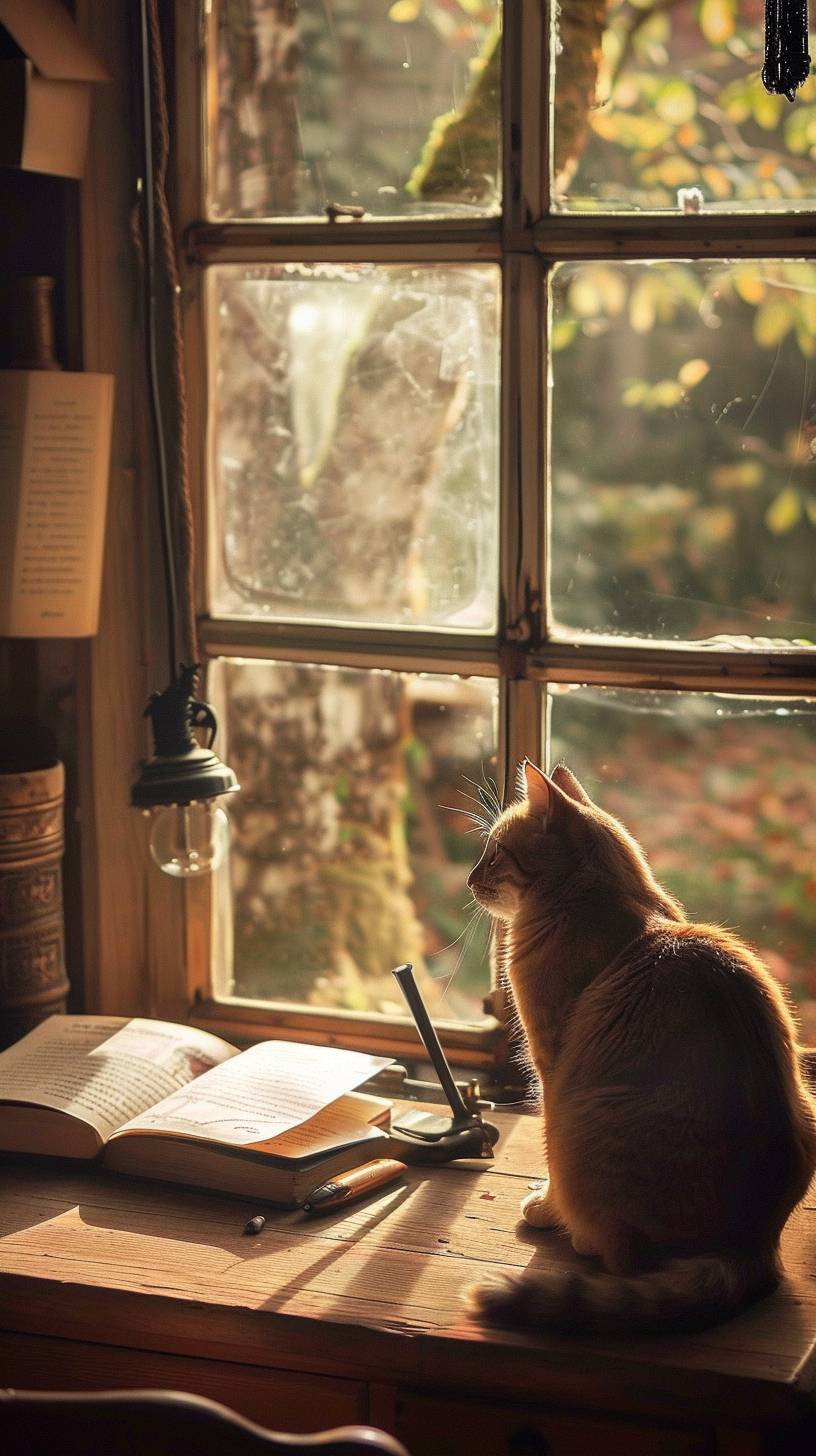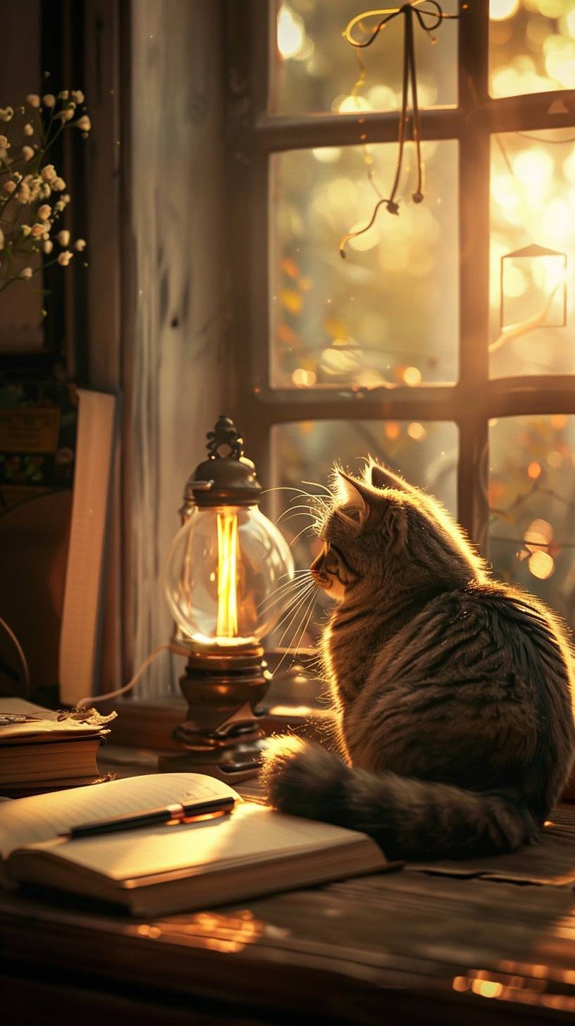 photo of sight. It is a window with a light of nose quality close to the real thing, and there is a cat on the desk, and the pen on the diary moves alone to write. --ar 9:16 --v 6.0