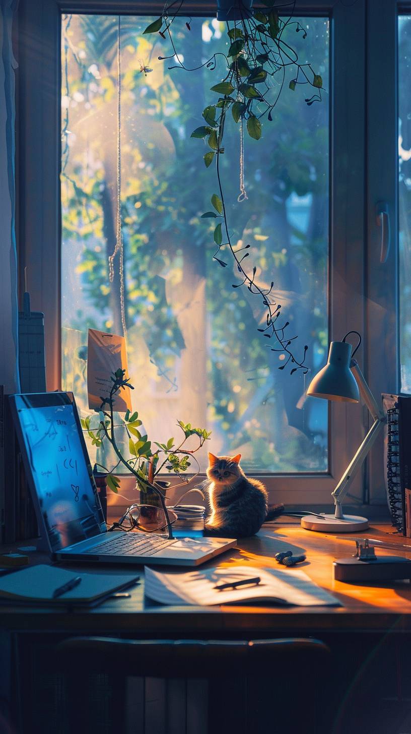 Esta es una vista de una ventana, con una calidad de luz cercana a la realidad. Hay un gato en el escritorio, y la pluma en el diario se mueve sola para escribir.