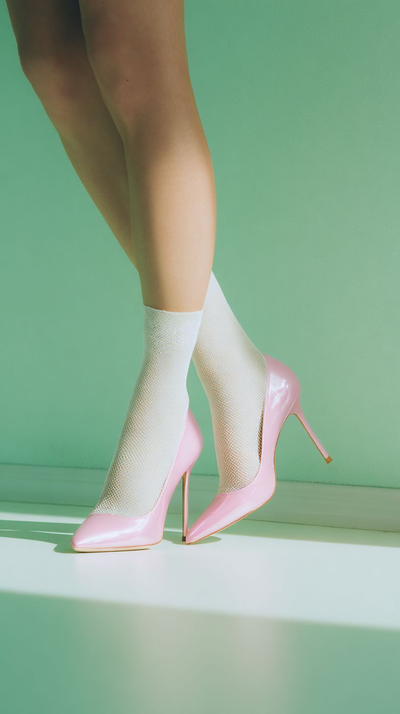 a cinematic close-up shot of slim elegant female ankles in sheer white ankle socks, wearing glossy high pink stiletto heels, extreme fashion editorial detail, the shoes and ankles filling most of the frame, standing gracefully on a smooth mint-colored floor, with a soft pastel light-green wall background, dreamy pastel fashion aesthetic, cinematic lighting, analog film still, sharp focus, retro yet modern look --ar 9:16 --raw
