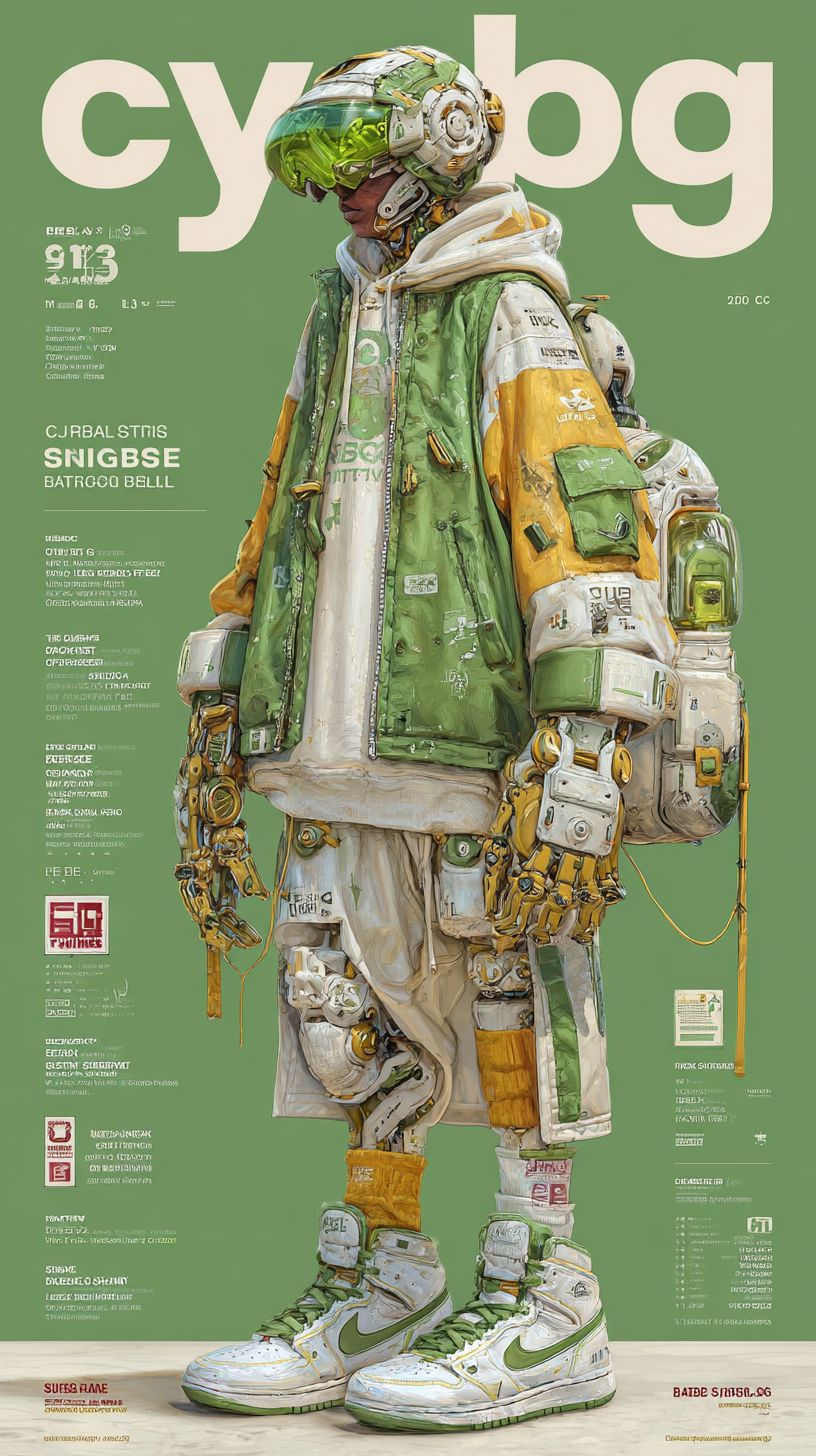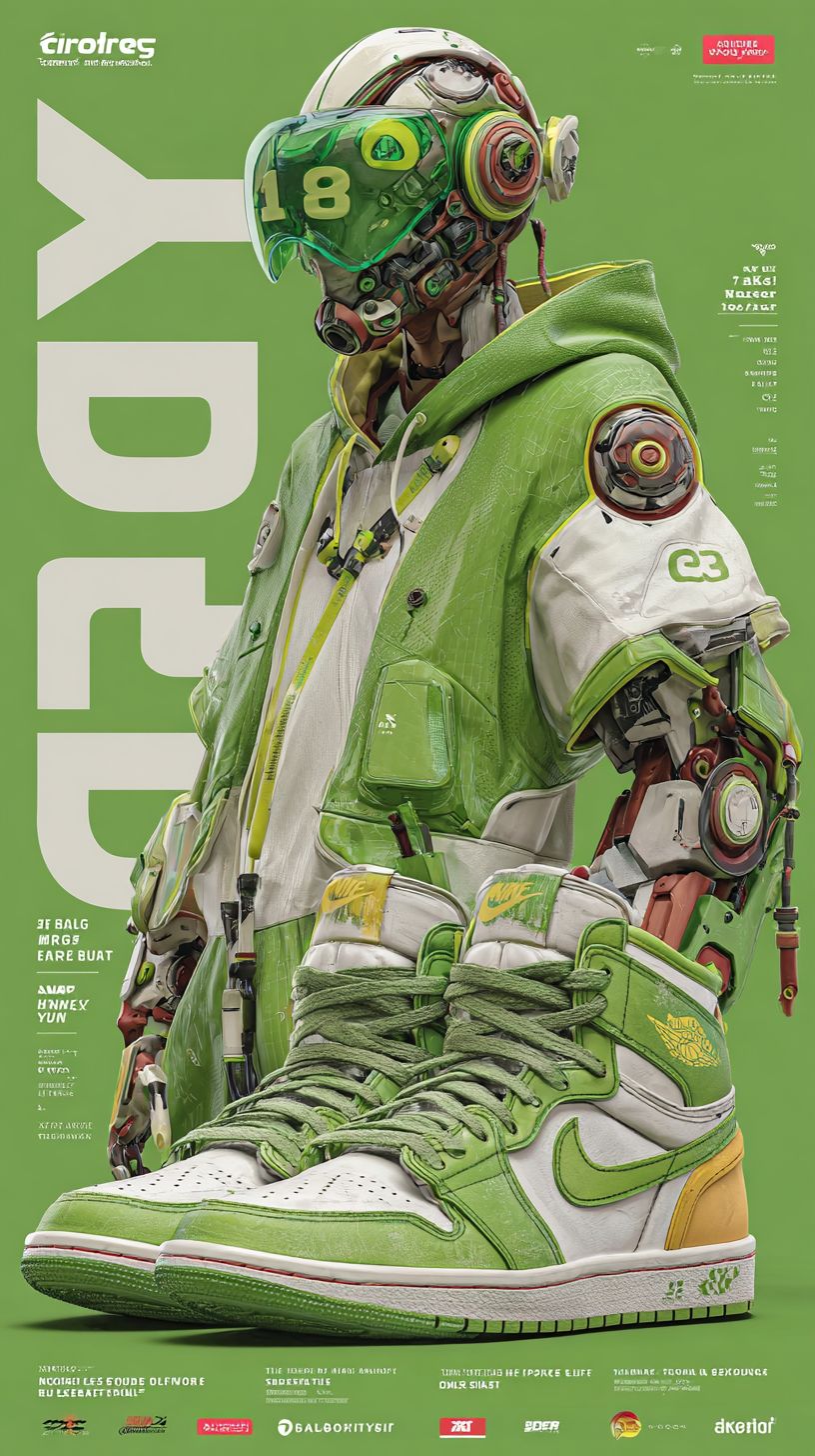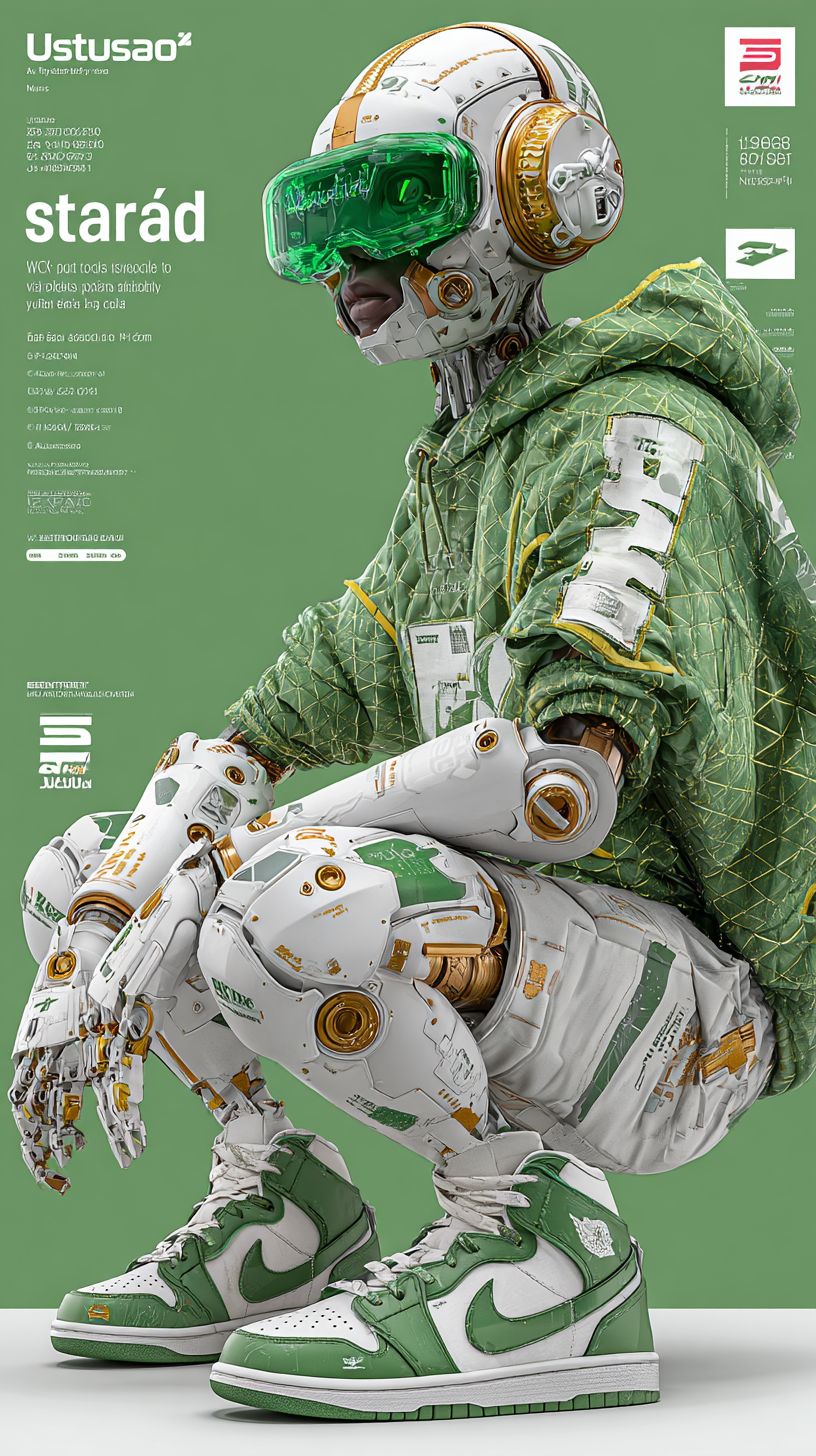"a cyborg basketball star in green and white sneakers and armor hoodie, wearing emerald-themed tech visor, stylized like a high-end sneaker ad poster" --ar 9:16 --stylize 400 --v 7.0