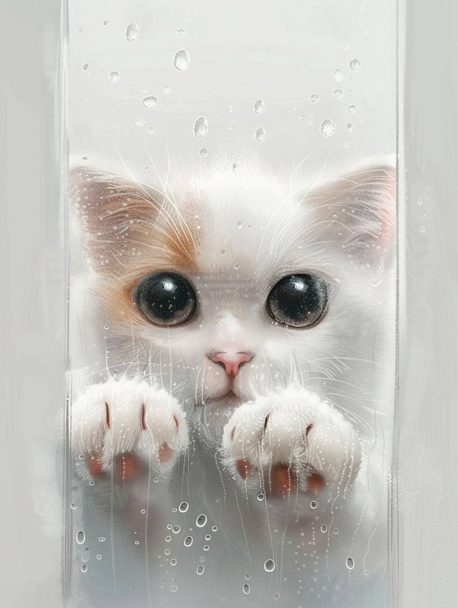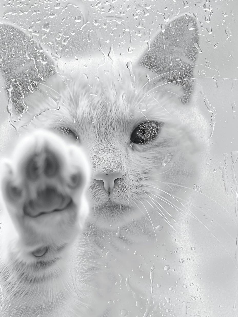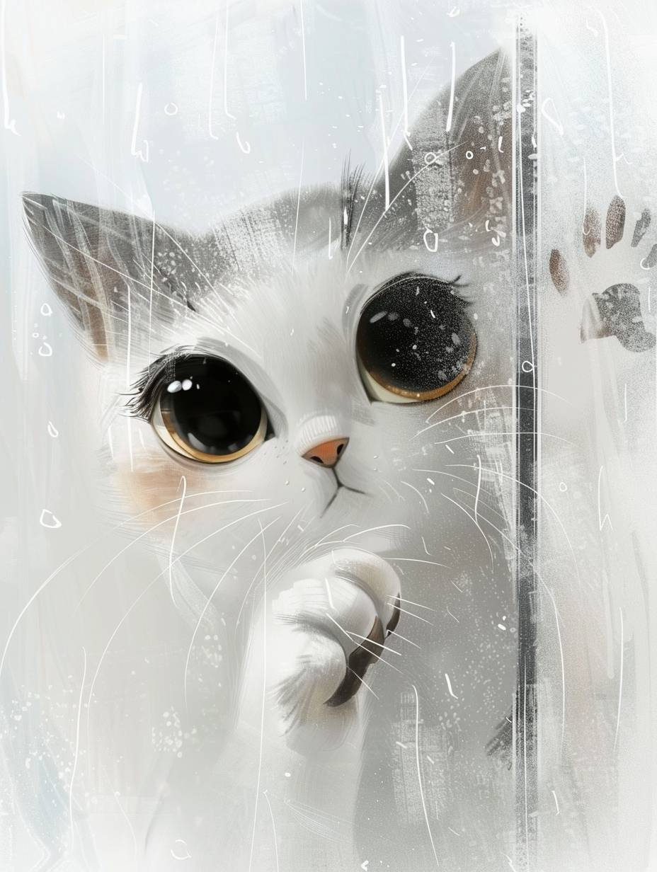 Through frosted glass, a cute cat face with a hazy texture, with a paw on the glass. Simple background and cartoon style. Featuring white and gray, adopting minimalist design --ar 3:4 --v 6.0